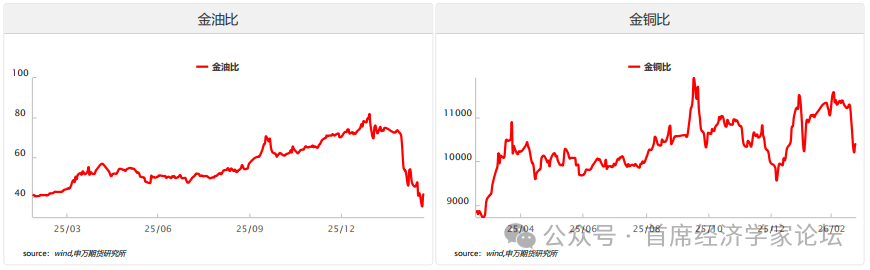 金油比方面,近期由前期地缘冲突驱动的快速回落阶段略有回升,当前油价因供给端冲击形成的短期溢价正逐步消化,而黄金在央行购金与降息预期支撑下展现更强韧性。这一回升意味着市场对地缘风险的计价趋于理性,原油的短期脉冲式上涨难掩黄金的中期配置价值,后续若地缘缓和延续,金油比将稳步向合理区间抬升,为“金转油”轮动创造更清晰的比价窗口。 金铜比方面,在高位基础上略有回升,且持续高于近5年均值,核心源于国内弱复苏背景下铜需求乏力、黄金强势上涨的格局分化。资金从工业金属等风险资产向贵金属避险资产倾斜的趋势未改,短期避险情绪难降温,黄金相对沪铜的超额收益优势延续,预示资金风险偏好仍处低位,金铜比的高位震荡将进一步支撑贵金属的结构性配置价值。