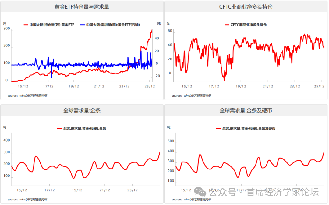 3、交易者结构分析 黄金交易者结构呈现“散户情绪回暖、机构配置增强、国际投机偏谨慎、FOF对冲加码”的多元格局。 散户层面,上金所小额现货成交与银行金条销量环比回升,叠加黄金ETF小额申购占比提升,反映“大妈”等民间投资者在金价高位仍有逢低配置意愿,但回购量同步增加,显示获利了结压力上升,散户行为更趋短期化。 机构方面,沪金期货前20名会员多头持仓占比抬升,黄金ETF机构持有占比突破70%,保险、公募商品基金等大型资管持仓稳步增长,体现专业机构对黄金作为对冲工具的长期配置价值认可,成为价格中枢的核心支撑。 国际投机端,CFTC非商业净多头持仓虽处高位但环比小幅回落,显示海外投机资金在美联储降息预期下仍偏多,但对高位波动的警惕性提升,多空分歧加大。 大类资产FOF层面,黄金在多策略组合中的权重较去年末提升1.2个百分点,风险平价模型隐含仓位同步上行,反映FOF通过增配黄金对冲股债双弱与地缘尾部风险,进一步强化了黄金的战略配置属性。