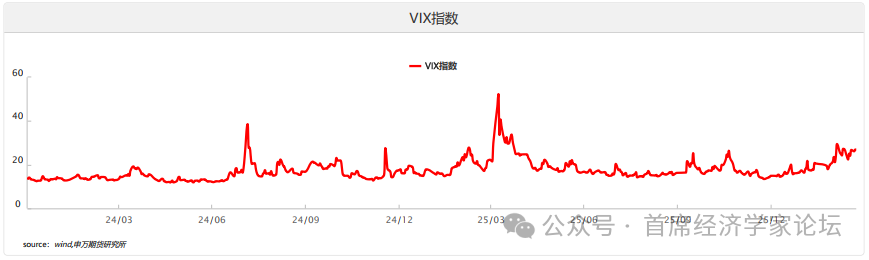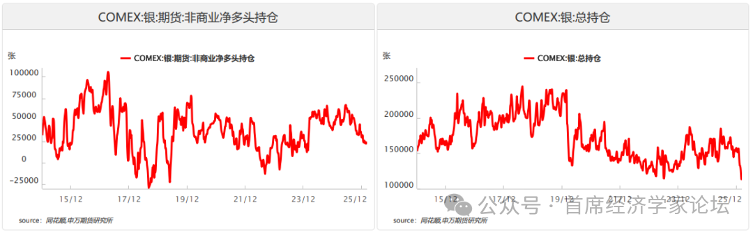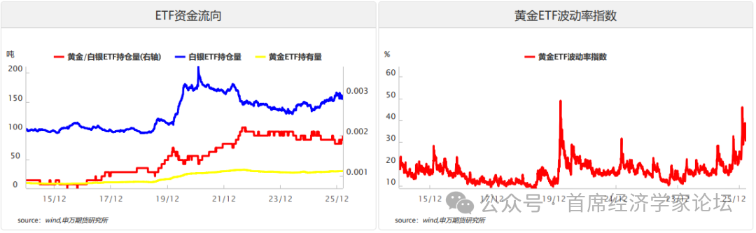 2.ETF资金流向 通过分析全球主要黄金/白银ETF(如GLD、SLV)持仓量的增减,来反映机构和散户的投资情绪和资金进出。数据显示近期资金持续流入贵金属ETF市场。黄金ETF持仓稳步抬升,反映机构与长期配置型资金对黄金的避险与保值需求持续增强;白银ETF持仓虽有波动但整体维持高位,表明市场对白银的工业需求与估值修复预期仍存。从趋势看,ETF资金持续流入为贵金属价格提供了坚实的资金支撑,尤其是黄金ETF持仓的稳步增长,印证了市场对美联储降息、地缘风险及美元信用弱化的中期看涨逻辑。白银ETF持仓的波动则反映出其兼具金融与工业属性的特征,短期受宏观情绪扰动更大。整体而言,ETF资金的持续流入强化了贵金属的上行基础,若资金流入趋势延续,将进一步推动黄金与白银价格中枢上移;反之,若出现大规模资金撤离,则需警惕短期回调风险。 波动率方面,黄金ETF波动率指数近期快速攀升,突破近一年中枢水平,反映市场对地缘风险、美联储政策及美元信用的担忧加剧,风险预期显著抬升。波动率上行与价格同步走高,打破了“高波动对应价格下行”的传统逻辑,核心驱动在于避险需求与资金涌入的共振。短期波动率维持高位,意味着黄金价格弹性增强,既可能放大上行空间,也会加剧回调幅度;中期来看,若波动率逐步回落至合理区间,将为趋势性上涨提供更稳定的环境。