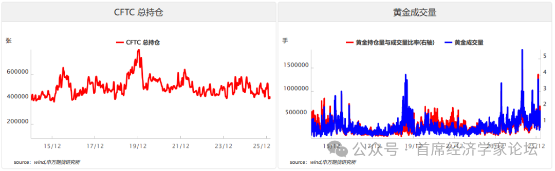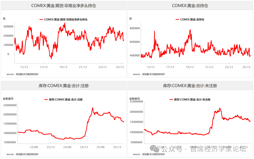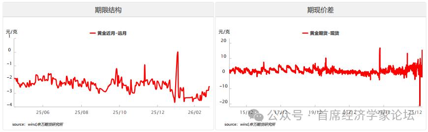 三、资金流动 1.期货市场数据 持仓量:CFTC黄金总持仓维持在高位区间,非商业净多头持仓虽较前期高点有所回落,但仍处于历史偏高水平,显示机构资金对黄金的中期看涨共识未破。近期净多头小幅减仓,主要源于高位获利了结与短期波动加剧,而非趋势性看空。持仓结构上,商业空头套保比例同步抬升,产业端对高价的谨慎态度显现,多空分歧加大,预示短期黄金或进入震荡整固阶段,但中期趋势性上涨的资金基础依然稳固。 成交量:黄金日均成交量近期显著放大,叠加持仓量与成交量比率同步抬升,反映市场活跃度与流动性显著增强。量仓同步上行,验证了本轮黄金上涨的资金动能充足;但局部时段出现“量增仓稳”的背离信号,显示部分资金在高位兑现收益,短期波动风险上升。从结构看,大额成交集中在主力合约,远月合约成交清淡,市场对短期价格波动的关注度更高,流动性主要集中在近月端,对突发消息的反应更为敏感。 期限结构:黄金期限结构维持contango结构,近月-远月价差小于0,但从图表走势可见,近月-远月价差已由前期低位有所回升、逐步收窄,表明市场对未来供需宽松的过度预期有所修正,短期悲观情绪边际缓和。此前价差持续下行,反映资金倾向于在远月合约布局长期多头,同时现货供应相对充裕、短期上涨信心偏弱,对近月价格形成压制;近期价差回升,意味着近月合约相对远月的贴水幅度收窄,市场对短期供需紧平衡的预期重燃,资金对近月合约的关注度有所提升,为价格企稳提供了结构支撑;从历史规律看,Contango结构收窄往往对应库存去化预期增强、现货需求回暖,若价差继续向零轴靠拢甚至转正(转为Back结构),将进一步打开期货价格上行空间。 期现价差:黄金期现价差近期出现显著结构变化:由前期大幅升水快速转为小幅贴水(现货略高于期货),贴水幅度可控且未创历史极值,反映市场从“期货领涨、现货滞后”向“期现收敛、供需再平衡”过渡。前期期货价格受降息预期与地缘避险情绪驱动快速上行,现货端因物流、交投节奏等因素跟进偏慢,形成较大幅度升水,跨期套利窗口打开,资金倾向于做多现货、做空期货进行套利。近期随着现货买盘逐步跟进、期货端获利了结盘增多,期现价差快速收窄并转为小幅贴水,说明现货需求韧性显现,期货价格阶段性高估得到修正,市场对黄金的配置需求从“预期驱动”转向“现货支撑”。