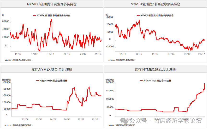 3、铂与钯基本面分析 截至3月17日,NYMEX铂金总持仓为6.73万张、周环比下降1466张。其中,商业多头持仓环比下降1021张至1.95万张,商业空头持仓增加980张至4.25万张,非商业多头持仓下降224张至3.02万张,非商业空头持仓下降2432张至1.33万张,非商业套利持仓下降115张至8845张,非商业净多头持仓环比增加2208张至1.69万张。NYMEX钯金总持仓为1.56万张、周环比下降123张。其中,商业多头持仓环比下降324张至4958张,商业空头持仓下降348张至6341张,非商业多头持仓增加103张至7258张,非商业空头持仓增加132张至7443张,非商业套利持仓增加45张至706张。 截至3月23日,NYMEX铂金库存共计57.93万盎司。其中,注册库存为30.86万盎司、占比为53.27%,未注册库存为27.07万盎司、占比为46.73%。NYMEX钯金库存共计24.84万盎司。其中,注册库存为16.42万盎司、占比为85.31%,未注册库存为3.65万盎司、占比为14.69%。