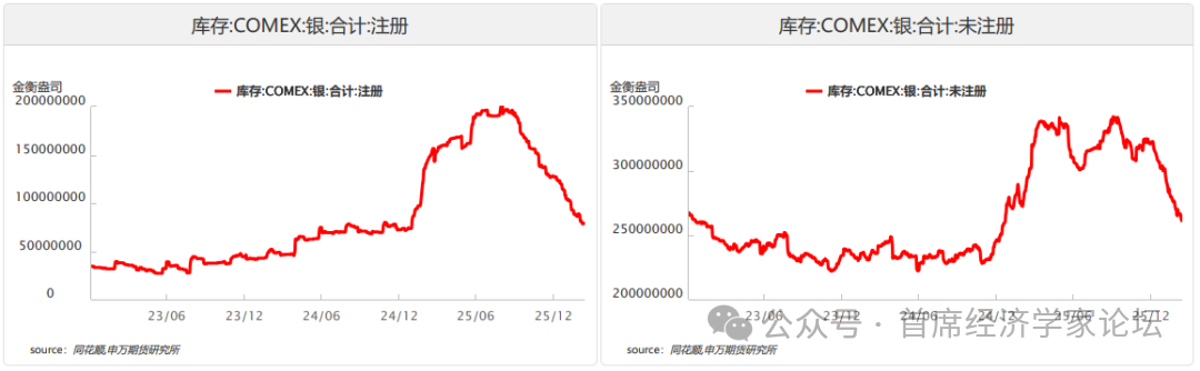 2、白银基本面分析 截至3月17日,COMEX白银总持仓为11.48万张、周环比下降0.07万张。其中,商业多头持仓环比增加149张至3.19万张,商业空头持仓下降3070张至7.03万张,非商业多头持仓下降2181张至3.11万张,非商业空头持仓增加516张至0.92万张,非商业套利持仓增加1754张至2.54万张,非商业净多头持仓环比下降2697张至2.19万张。 截至3月24日,COMEX白银库存共计33145.2万盎司、周环比下降644.1万盎司。其中,注册库存为7654.9万盎司、占比为23.09%,未注册库存为25490.3万盎司、占比为76.91%。截至上周,上期所白银期货库存为362.50吨、周环比增加35.93吨。 白银价格近期出现较大幅回调,驱动银价的逻辑亦发生明显转变——从避险转向通胀。 美以伊冲突初期促使市场避险情绪上升,推动资金配置金银,但随着霍尔木兹海峡局势紧张、能源设施遭打击,原油等大宗商品价格短期内大幅上涨,通胀回升预期随之而来,表现为美国国债收益率在短期内大幅上涨。美联储3月议息会议释放的鹰派信号是触发此轮金银价格下跌加快的重要因素。同为零息资产,白银的持有成本随利率预期上升而显著增加。此外,美联储资产负债表显示的流动性紧缩,也不利于对利率敏感的白银等资产。
