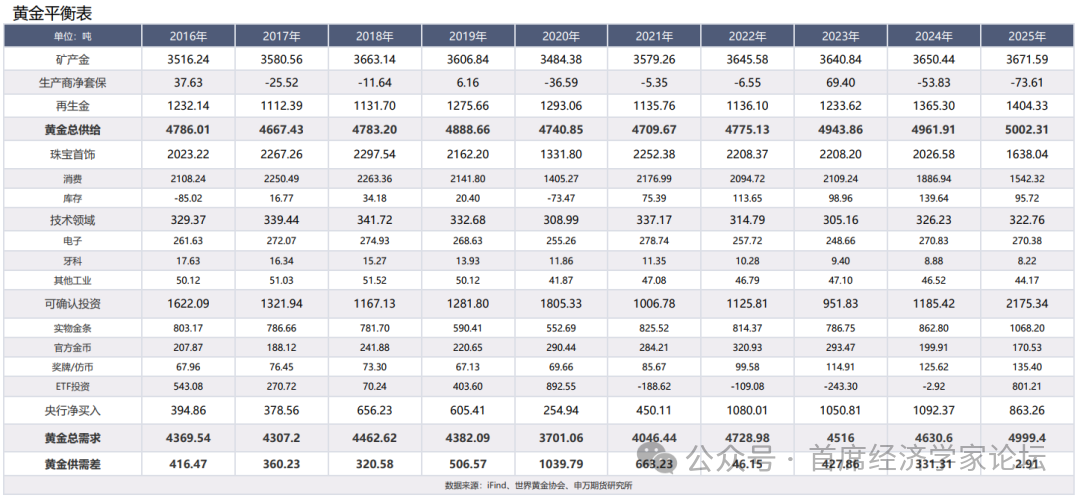世界黄金协会数据显示:2月全球实体黄金支持的ETF录得53亿美元资金流入,连续第九个月净流入,总持仓量增加26公吨至创新高的4171公吨,其中,北美地区贡献47亿美元,亚洲贡献23亿美元,欧洲为唯一流出地区,地缘政治紧张仍是投资者持续关注黄金的重要驱动因素。 进入2026年,黄金市场的供需格局呈现出短期资金驱动与长期战略配置双驱动的特征。回顾2023年至2025年的数据,可以清晰地看到市场需求增量的演变:可确认投资需求从2023年的951.83吨,增长至2024年的1185.42吨,并在2025年跃升至2175.34吨,实现了接近翻倍的增幅。 这轮投资需求的爆发,核心驱动在于黄金ETF的持续增加。2023年和2024年,黄金ETF市场分别录得-243.30吨和-2.92吨的净流出状态,反映了在美联储加息周期末期,投资者持有成本较高,更倾向于通过其他渠道配置黄金。然而,这一趋势在2025年发生了根本性转变。随着美联储降息预期升温,叠加全球地缘政治风险的累积,资金开始大规模回流。 2025年,黄金ETF投资需求激增至801.21吨,这一巨大的增量直接推动了可确认投资总需求创下近年新高。进入2026年,特别是2月底美伊冲突爆发后,避险情绪被瞬间点燃,资金通过ETF渠道快速涌入黄金市场成为最直接的反应。对于全球投资者而言,购买实物黄金ETF比直接持有金条更为便捷,这使得ETF成为吸收短期巨量避险资金的核心载体,进而成为推动2026年金价上行的核心驱动。 与ETF驱动的短期波动不同,全球央行的购金行为构成了黄金需求的“压舱石”。2023年至2025年,全球央行净买入量分别为1050.81吨、1092.37吨和863.26吨。虽然2025年的买入量较前两年创纪录的高位有所回落,但这并不改变其结构性转变的本质,新兴市场央行将黄金作为对冲地缘政治风险和美元信用减弱的工具,已从短期策略转变为长期战略。 整体来看,2026年黄金的供需基本面,是建立在央行持续多年的结构性买入所构建的坚实基础上,并由2025年以来ETF资金的大规模流入所点燃。2026年初的地缘政治冲突,则是在此基础上,进一步强化了ETF的避险功能,使其成为短期内驱动金价的最主要力量。