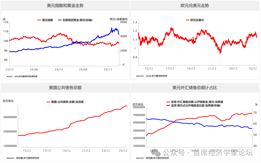 4.美元指数与汇率 近期特朗普释放冲突缓和信号,避险情绪降温,美元指数跌破100关口。此前由于美伊冲突持续升级,显著推升了全球地缘政治不确定性,市场风险偏好随之快速收敛。在避险情绪的驱动下,资金加速涌入美元这一传统避险资产,短期内对美元指数构成支撑,推动其阶段性走强。与此同时,市场对美联储降息的预期有所降温,进一步强化了美元的短期表现。 尽管美元在避险逻辑下短期获得提振,从中长期视角来看,其信用根基正面临多重结构性因素的侵蚀:(1)联邦债务规模持续走高,市场对美国财政可持续性的担忧加剧,使得美元信用基础趋于弱化。(2)特朗普频繁施压美联储、干预美联储独立性,削弱了市场对美元的制度信任。(3)近年来全球地缘政治风险抬升,全球政治经济秩序重构,各国央行推进储备资产多元化,美元在外汇储备中占比下降。因此,从中长期看,美元信用弱化的趋势难以逆转,去美元化进程将持续推进。