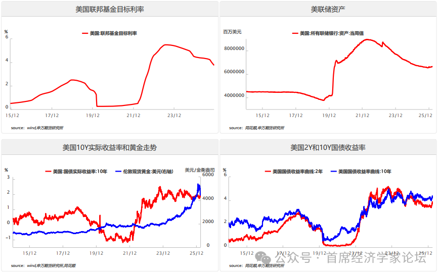 2.主要央行货币政策 美联储3月议息会议如期按兵不动,将联邦基金利率目标区间维持在3.5%至3.75%不变。尽管点阵图显示2026年和2027年各有一次降息,与12月点阵图一致,但本次会议整体释放出鹰派信号。议息声明措辞变化不大,对就业市场的表述由“失业率显示出一些稳定的迹象”调整为“近几个月失业率基本保持不变”,同时强调中东局势的影响,新增“中东事态发展对美国经济的影响尚不确定”。 从经济预测来看,美联储上调2026年经济增速和通胀预测,并上调长期联邦基金利率预测。经济增长方面,美联储将2026、2027、2028年实际GDP增速分别上修0.1、0.3、0.2个百分点至2.4%、2.3%、2.1%。通胀方面,2026、2027年PCE同比分别上修0.3和0.1个百分点至2.7%和2.2%,核心PCE同比分别上修0.2和0.1个百分点至2.7%和2.2%,2028年通胀预期维持不变。长期联邦基金利率预测从3%小幅上调至3.1%。鲍威尔表示在没有看到通胀改善之前,不会考虑降息,并证实委员会内部已经开始讨论“下一步是否可能加息”,尽管这并非基准情景假设。 当前油价持续上行使得通胀风险大幅抬升,美联储在充分就业与物价稳定的双重使命下陷入两难,短期只能保持观望,对降息更为谨慎,降息路径将依托后续经济数据而定。根据CME美联储观察市场预期2026年将不再降息,2027年首次降息也推迟到9月。当前市场降息预期对通胀风险计价已经较为充分,后续主要关注美伊冲突持续时间,如果地缘局势缓和,沃什上台后降息预期存在修复空间。 3.利率与实际收益率 伊朗封锁霍尔木兹海峡的风险,引发市场对原油供给中断的恐慌情绪,推动国际油价脉冲式上涨,通胀预期快速升温,市场下修美联储降息预期,推动美债利率快速上行。美国10年期国债收益率从2月末的3.97%上行至3月24日的4.39%,上行42个bp。名义利率的上行速度超过了通胀预期的涨幅,导致10年期美债实际利率同步上行,10年期实际收益率从2月末的1.72%下行至3月24日的2.06%,上行34个bp。实际利率上行意味着持有黄金的机会成本上升,这构成了对金价的直接压制。后续如果地缘冲突缓和,美联储降息预期回升,美债利率有下行可能。