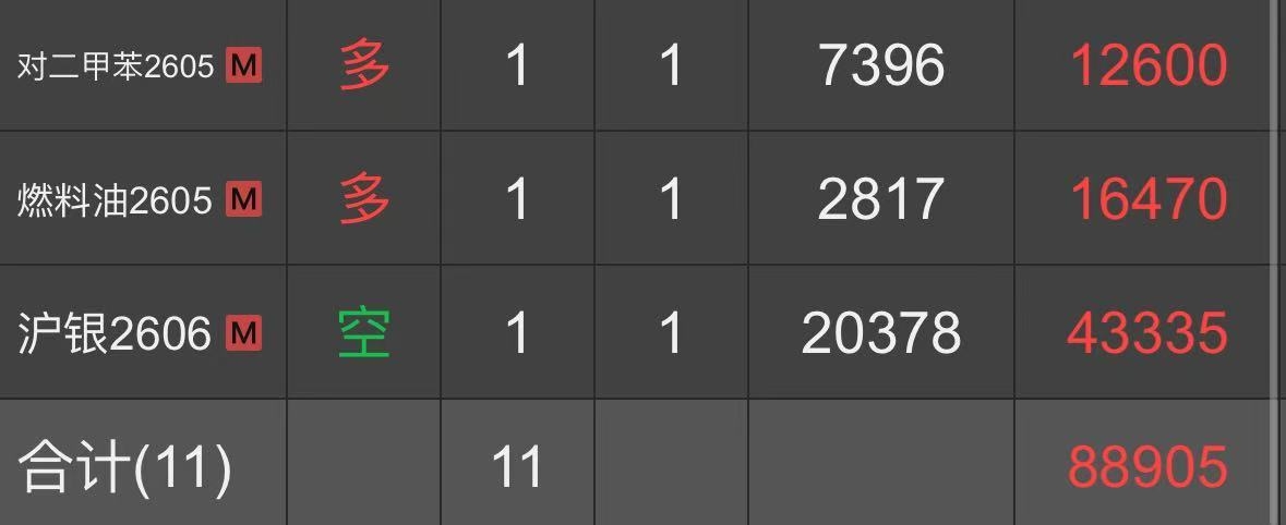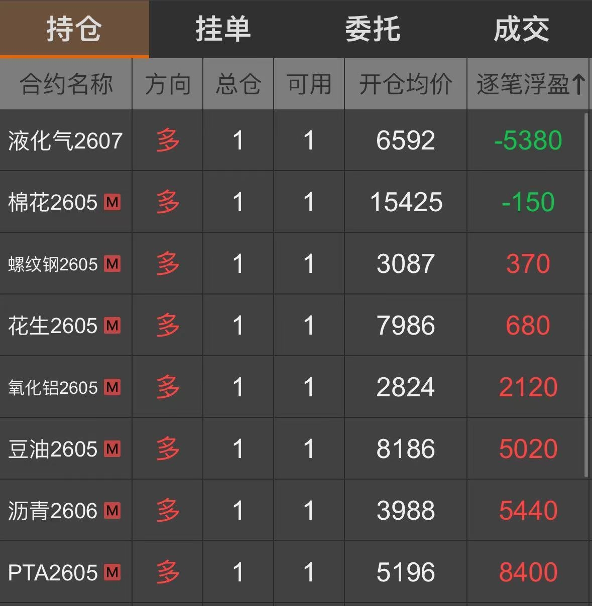 | 一、开仓总结 燃料油:2026年1月9日,达到启动点的开仓条件,所以在14:56开多一手燃料油2603合约,开仓价为2514。燃料油2603合约于2026年2月5日21:35移仓至主力合约2605,开仓价为2817。 PTA:2026年2月10日,达到启动点的开仓条件,所以在14:53开多一手PTA2605合约,开仓价为5230。 沥青:2026年2月25日,达到启动点的开仓条件,所以在14:50开多一手沥青2604合约,开仓价为3359。沥青2604合约于2026年3月12日14:41移仓至主力合约2606,开仓价为3988。 豆油:2026年2月26日,达到启动点的开仓条件,所以在14:45开多一手豆油2605合约,开仓价为8186。 液化气:2026年2月26日,达到启动点的开仓条件,所以在14:45开多一手液化气2604合约,开仓价为4557。液化气2604合约于2026年3月23日21:54移仓至液化气2607合约,开仓价为6592。 对二甲苯:2026年2月27日,达到启动点的开仓条件,所以在14:53开多一手对二甲苯2605合约,开仓价为7396。 氧化铝:2026年3月6日,达到启动点的开仓条件,所以在14:46开多一手氧化铝2605合约,开仓价为2824。 螺纹钢:2026年3月6日,达到启动点的开仓条件,所以在14:47开多一手螺纹钢2605合约,开仓价为3087。 花生:2026年3月10日,达到启动点的开仓条件,所以在14:59开多一手花生2605合约,开仓价为7986。 沪银:2026年3月17日,达到启动点的开仓条件,所以在14:56开空一手沪银2606合约,开仓价为20378。 棉花:2026年3月26日,达到启动点的开仓条件,所以在14:54开多一手棉花2605合约,开仓价为15425。 二、平仓计划 燃料油:达到启动点的平仓止损/止盈条件,在收盘前或下一个交易日开盘后全部平仓。 PTA:达到启动点的平仓止损/止盈条件,在收盘前或下一个交易日开盘后全部平仓。 沥青:达到启动点的平仓止损/止盈条件,在收盘前或下一个交易日开盘后全部平仓。 豆油:达到启动点的平仓止损/止盈条件,在收盘前或下一个交易日开盘后全部平仓。 液化气:达到启动点的平仓止损/止盈条件,在收盘前或下一个交易日开盘后全部平仓。 对二甲苯:达到启动点的平仓止损/止盈条件,在收盘前或下一个交易日开盘后全部平仓。 氧化铝:达到启动点的平仓止损/止盈条件,在收盘前或下一个交易日开盘后全部平仓。 螺纹钢:达到启动点的平仓止损/止盈条件,在收盘前或下一个交易日开盘后全部平仓。 花生:达到启动点的平仓止损/止盈条件,在收盘前或下一个交易日开盘后全部平仓。 沪银:达到启动点的平仓止损/止盈条件,在收盘前或下一个交易日开盘后全部平仓。 棉花:达到启动点的平仓止损/止盈条件,在收盘前或下一个交易日开盘后全部平仓。 注:本交易总结由第三方提供,只作为投资理念和方法的交流,不作为七禾网的观点,也不作为投资参考和建议。 附: 1、交易者简介 十年股票/期货/外盘交易经验,每年都实现投资盈利。 擅长微观盘面分析和宏观市场分析,总结了数套有效的盈利模式,和众多高手有深入交流,收益良好。 2、持仓截图
