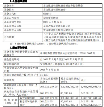 | 近日,易方达基金发布易方达成长领航混合型证券投资基金基金合同生效公告。 募集期间净认购金额1,068,908,601.48元,认购资金在募集期间产生的利息342,651.99元,募集份额合计1,069,251,253.47份。 基金经理蔡荣成现任易方达基金管理有限公司基金经理。曾任易方达基金管理有限公司基金经理助理、研究部总经理助理、行业研究员。