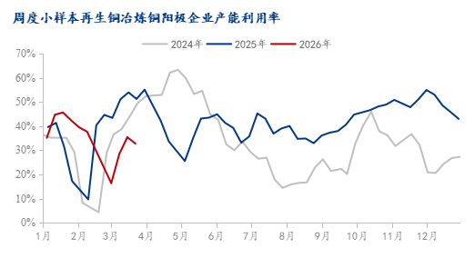 数据来源:Mysteel 再生铜供应:货商亏损幅度先扩后缩,出货意愿有所松动 废紫铜方面,本周铜价维持震荡走势,市场成交略有回暖。上游贸易商现货库存亏损幅度先扩后缩,出货意愿表现一般,适当将低价货源售出,再逢低补库拉低成本位,采销两端保持较谨慎操作,市场现货多流向有前期高价订单的贸易商。 废黄铜方面,本周铜价先抑后扬,废黄铜价格随行就市。周初,铜价大幅下跌,上游货商库存亏损幅度扩大,除开少量高价成交外,整体出货态度表现消极;随后铜价逐步回升,部分低价库存扭亏为盈,市场现货供应也随之有所改善。 再生铜需求:精废价差有所修复,厂家采购需求随之回升 废紫铜方面,下游厂家原料库存处于低位,随着精废价差有所修复,部分厂家原料需求有所回升。然而,市场废铜现货量少价高,厂家多依据成品订单情况补库原料,但议价能力有限,采购进度缓慢,除高价采购厂家外整体成交有限。 废黄铜方面,由于本周铜价波动幅度较大,多数终端企业持谨慎态度,以维持刚需采购为主。加之市场现货价格居高不下,使得多数下游黄铜厂家选择以销定采购的补库策略,有无订单的采购报价存在差异,实际成交也呈分化态势。 阳极市场:利润倒挂及原料采购成本居高,阳极加工企业产能利用率下滑 据本期Mysteel调研数据显示,国内36家再生铜冶炼铜阳极生产小样本企业阳极板周度产能利用率为32.76%,较上期下降2.76%。受废铜原料价格坚挺、精废价差收窄影响,再生铜冶炼阳极企业加工利润倒挂,对高价货源接受度低。随着原料库存持续下降,部分企业选择减停产或转产利润更优的铜材,产能利用率因此有所下滑。