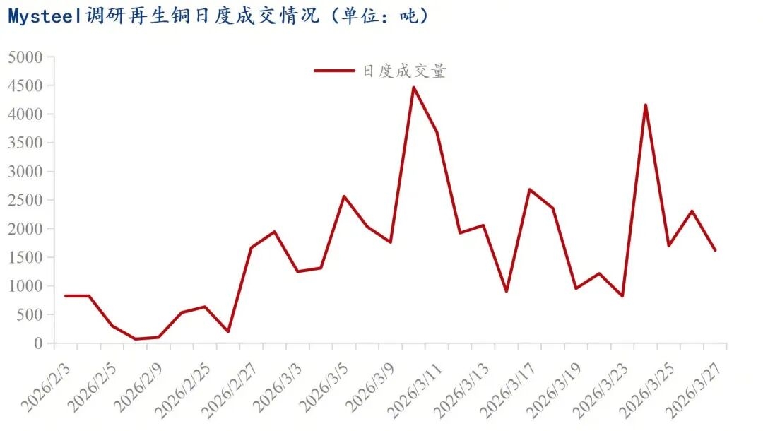 数据来源:Mysteel 成交:增幅30.83% 3月27日,根据Mysteel调研国内28家再生铜交易企业(含加工厂、贸易商),本周成交量为10609吨,环比上周增加2500吨,增幅30.83%。