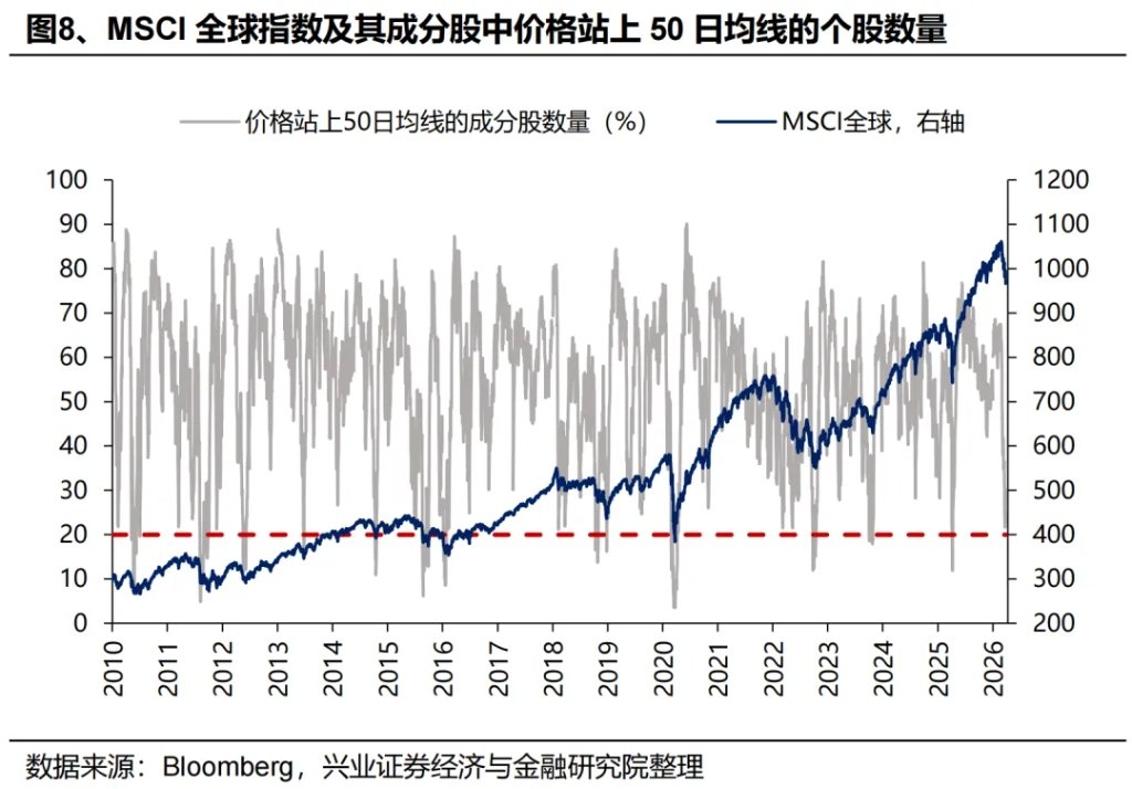 第七,在全球经济不陷入衰退的基准假设下,当前地缘政治冲突对美股的冲击已和历史水平相当,后续大幅下跌的空间或有限。我们整理了1939年以来全球25次地缘政治冲突对美股的影响后发现,短期而言(战争爆发后60个交易日内),标普500最大跌幅中位数/均值为5.1%/7.1%,见底则需要20余个交易日,而本轮美以伊战争爆发后,3月以来美股已下跌7.4%。此外,若仅以二战结束后的地缘政治冲突为样本,我们发现只有当战争期间美国经济出现衰退,标普500的最大跌幅才会达到两位数以上,例如1973年的石油战争、1990年海湾战争和2001年911恐怖袭击。此外,截至2026/3/27,MSCI全球指数中站上50日均线的成分股数量占比已回落至25.37%,指向本轮市场的抛售程度已经接近历次底部水平。