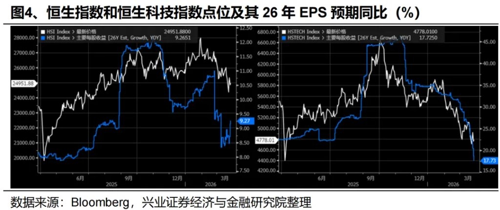 | 一、港股见底了吗? 展望后续,短期地缘冲突的节奏难以把握,外围扰动下港股将“跟随式”波动。但是考虑到港股对悲观预期的充分定价,盈利下修压力缓解,叠加中期美伊谈判预期,我们对港股也并不悲观。因此,港股当前做多和做空的风险收益比可能都不高,最优策略是“静观其变”,若后续美军超预期军事行动引发市场恐慌性抛售,届时可能是TACO和超跌反弹的真正契机。 第一,鉴于短期不确定性较高,全球风险资产大概率维持高波动,港股或继续受到海外风险偏好回落的抑制。在《 美伊追踪4:可否开始预期局势的降级?(20260325)》中我们指出,当前特朗普仍缺乏直接“投降”的动机,市场担心的地面战争风险依然存在。据央视新闻消息,美国国防部正为在伊朗展开为其数周的地面行动做准备,因此短期全球市场或持续处于高波环境,拖累港股表现。