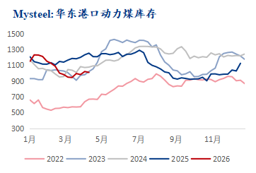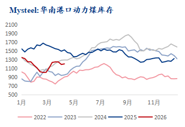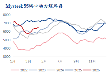 数据来源:钢联数据 江内区域:上周港口库存小幅下降,港口库存1137万吨,周环比减15万吨。港口调入量稍有增加,但现阶段属于传统淡季,电厂日耗保持低位水平,采购优先以长协拉运为主,整体需求释放较弱,市场成交表现平淡。