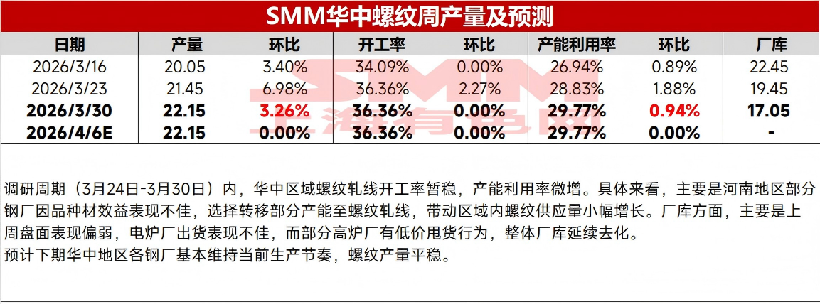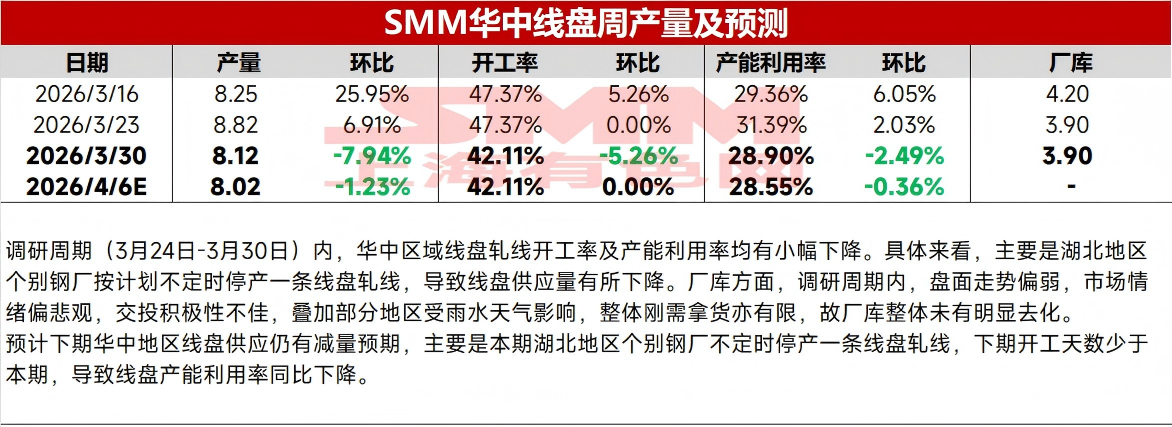 | 报告品种:螺纹钢 原文链接:https://mp.weixin.qq.com/s/Yyp9-9xsstDBQj1F492bsA 调研周期(3月24日-3月30日)内,华中区域螺纹开工率暂稳,产能利用率小幅增长;线盘开工率及产能利用率均有下降。