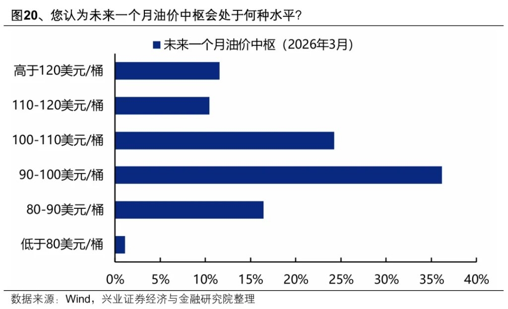 (二)地缘与油价:未来一个月油价中枢预期在90-100美元/桶,4月底或5月冲突缓和是基准情形 多数机构投资者认为美以伊冲突有望在4月底(35%)或5月(31%)迎来缓和。 认为未来一个月油价中枢在90-100美元/桶(36%)和100-110美元/桶(24%)的机构投资者比例较高。