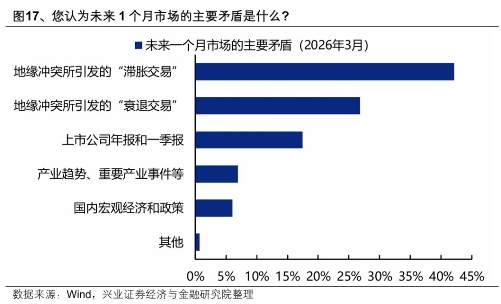 地缘冲突加剧(45%)、AI泡沫破裂(23%)和联储鹰派超预期(21%)是当前市场认为今年A股可能遭遇的最主要风险 。