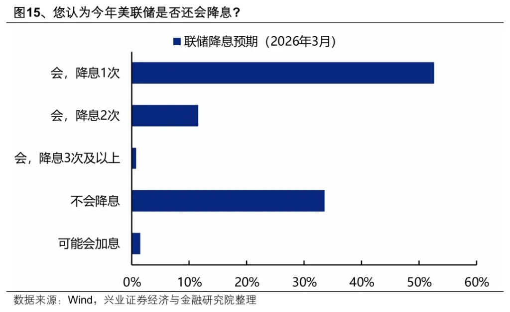 (二)流动性:多数投资者预期今年美联储将降息一次或不降息,不会加息 大多数机构投资者预期今年美联储将只降息一次(53%)或不降息(34%),认为可能会加息的比例较低(1%)。 大多数机构投资者对于国内央行也是预期将只降息一次(49%)或不降息(47%),认为可能会加息的比例较低(1%)。