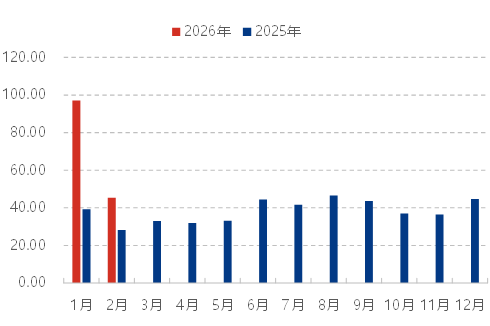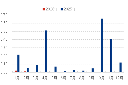 目前,已有部分企业,尤其是缺乏订单支撑的产线,开始执行停产或采用“堵窑”等技术手段进行强制性减产。这并非主动的战略调整,而是市场清冷下的被动生存反应。更为严峻的是,在缩水的订单“蛋糕”中,分配结构出现了严重的分化。有限的订单资源正迅速向头部优势企业集中。这些头部企业凭借规模效应、成本控制能力、品牌信誉及更稳定的客户关系,在争夺订单的竞争中占据绝对上风。相反,大量中小型产线及非头部企业则很难获取足够的订单以维持产线的连续运转,使得中小企业的生存压力呈几何级数增长,其产线永久性关停的可能性远大于头部企业。行业的产能出清,正以最残酷的方式加速进行。 然而在国内市场需求一片黯淡之际,海外市场成为了一抹难得的亮色,也成为了区分企业生存质量的关键分水岭。拥有出口业务和能力的企业,在当下相当于拥有了“多条腿走路”的主动权。 当国内需求疲软、价格承压时,这些企业可以迅速调整销售策略,加大外贸业务的比重。一方面,国际市场需求相对稳定,且对价格的敏感度与国内有所不同,出口价格往往优于国内市场,有助于企业维持更好的盈利水平。另一方面,出口业务有效分流了产能,缓解了国内市场的库存压力。从未来发展趋势看,海外布局的广度与深度,将直接构成企业的核心竞争优势。全球能源转型的大趋势未变,海外光伏市场空间广阔。那些早已在海外建立销售渠道、拥有认证资质、甚至布局海外产能的企业,不仅能在本轮国内行业调整中更具韧性,更能在未来市场复苏时,抢占全球市场的先机。出口业务已从“锦上添花”的选项,转变为决定生死的“生命线”。 海关总署数据显示,2026年1月中国光伏玻璃进口0.02万吨;2026年1月中国光伏玻璃出口97.05万吨,2026年1月,中国光伏玻璃净出口97.03万吨;2026年2月中国光伏玻璃进口0.01万吨,环比-49%,2026年1-2月累计进口量为0.03万吨;2026年2月中国光伏玻璃出口45.29万吨,环比-53%,2026年1-2月累计出口量为142.34万吨;2026年2月,中国光伏玻璃净出口45.28万吨,增速-53%。 图:2026年光伏玻璃进口量走势图(万吨)