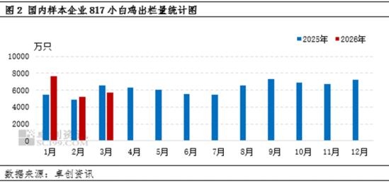 月内市场供强需弱 3月毛鸡理论供应量环比增多,对市场存利空影响。3月毛鸡供应主要受1月中下旬及2月上旬孵化企业鸡苗供应节奏影响,1月中下旬企业陆续恢复出苗,且中大型孵化企业鸡苗供应量逐渐增多,该阶段内样本企业出苗总量环比增多,进而导致3月毛鸡供应增多。据卓创资讯样本数据监测,3月817小白鸡样本企业出栏量为5670万只,供应量环比2月增加430.00万只,增幅8.20%,毛鸡理论供应增加,对毛鸡价格存利空影响。