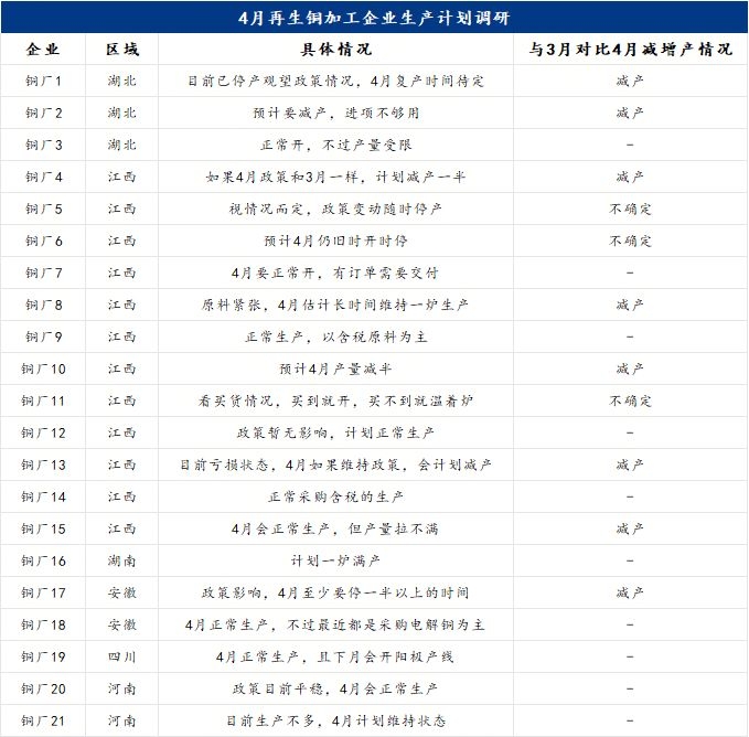 | 报告品种:铜 原文链接:https://youse.mysteel.com/a/26033018/E50D52127ED9E2A1.html 3月即将结束,市场政策再起风云,加上近期地缘政治冲突持续升级,宏观消息一变再变。在此背景下,4月份再生铜加工企业将何去何从?为此Mysteel再生铜团队针对21家再生铜加工企业4月的生产计划以及增减产情况进行调研,调研结果如下: