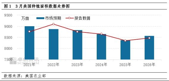 | 【导语】美国大豆的季度种植面积报告以及库存报告在3月底集中发布。从数据看,面积8470万亩,同比增加4%;库存总量21亿蒲式耳,同比增加11%。但对比报告前的预期看,面积数据低于预期值8555万亩,库存数据与预期值持平。综合来看,美豆的供应宽松压力有所减弱,而需求端的潜在增量需要在5月得以确认落地。卓创资讯预计4月美豆期货价格震荡走高,5月合约价格或涨至1200美分/蒲式耳。 美豆季度数据均同比增长 面积数据低于预期 根据美国农业部数据显示,2026年美国大豆种植面积预计为8470万英亩,同比增长4%,但低于市场预期值8555万亩。与之形成对比的是,2026年美国玉米种植面积为9530万亩,同比减少3%。因化肥等成本上涨,市场预期较多的玉米种植区将转换为大豆产区,但实际上美国的中西部主产区并没有发生大规模的调整种植计划。从具体的数据看,29个大豆种植州中有20个州的大豆种植面积将增长或保持不变。这对美国大豆价格形成偏利多的影响。