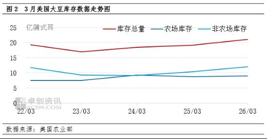 从库存数据看,截至2026年3月1日,美国大豆库存总量为21亿蒲式耳,同比增长10%。农场库存估计为9亿蒲式耳,同比增长3%。农场外库存为12亿蒲式耳,同比增长16%。2025年12月至2026年2月的大豆消费量为11.8亿蒲式耳,同比下降1%。从历年同期的数据走势看,2026年的数据为近5年来的同期最高值,反映出库存对价格的影响偏利空。但由于报告数据与市场预期值基本一致,因此利空的影响已经被提前消化,对美国大豆价格的影响较为有限。