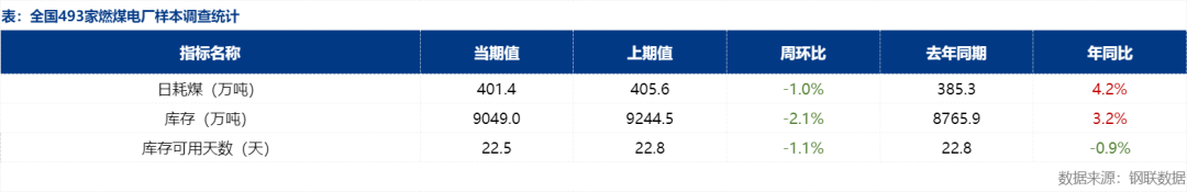 | 报告品种:焦煤 原文链接:https://mp.weixin.qq.com/s/xmtr1d8nk-awT_0iy0JSUw 近日,主产地区域内多数煤矿正常生产销售,市场煤供应基本稳定。现阶段下游各行业需求释放稀少,正值传统用煤淡季,市场参与者多看空后市,谨慎观望为主,坑口情绪较为平淡,煤矿整体销售一般,煤价继续呈现弱势维稳态势,部分煤矿出现涨跌互现的局面。 需求方面,当前,电厂日耗季节性回落,南方进入雨季后水电开始上升,北方各地区结束集中供暖,部分电厂陆续开启检修,煤电需求显著减少,叠加库存高企,终端电厂整体采购以刚需为主,市场观望情绪浓厚。非电方面,化工耗煤维持常态,需求释放有限,目前各环节库存较为充足,下游补库意愿不足。本文将对上周终端电厂样本数据进行解读,同时对于近期市场以及后续影响需求的因素进行简要分析。 据Mysteel统计,截至3月27日全国493家电厂样本日耗煤401.4万吨,环比降4.2万吨,厂内存煤总计9049.0万吨,环比降195.4万吨,可用天数22.5天,环比降0.3天。