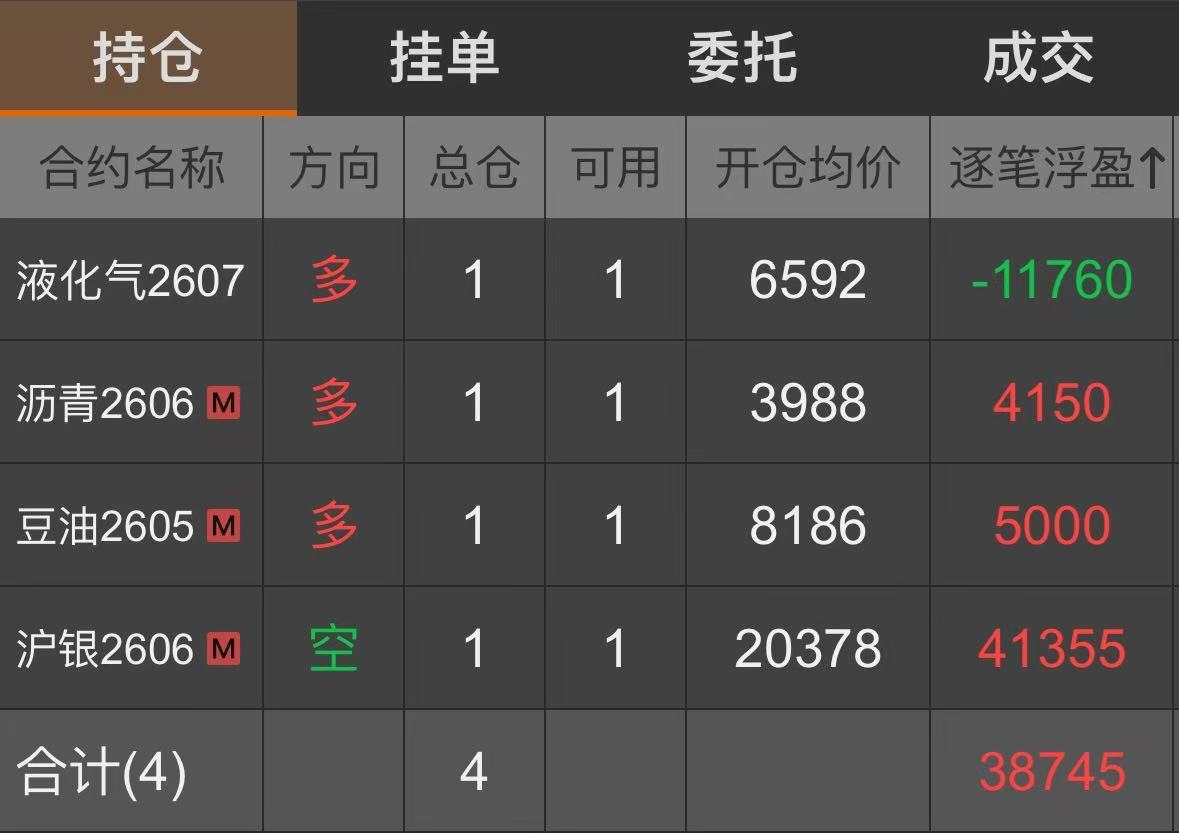 | 一、开仓总结 沥青:2026年2月25日,达到启动点的开仓条件,所以在14:50开多一手沥青2604合约,开仓价为3359。沥青2604合约于2026年3月12日14:41移仓至主力合约2606,开仓价为3988。 豆油:2026年2月26日,达到启动点的开仓条件,所以在14:45开多一手豆油2605合约,开仓价为8186。 液化气:2026年2月26日,达到启动点的开仓条件,所以在14:45开多一手液化气2604合约,开仓价为4557。液化气2604合约于2026年3月23日21:54移仓至液化气2607合约,开仓价为6592。 沪银:2026年3月17日,达到启动点的开仓条件,所以在14:56开空一手沪银2606合约,开仓价为20378。 二、平仓计划 沥青:达到启动点的平仓止损/止盈条件,在收盘前或下一个交易日开盘后全部平仓。 豆油:达到启动点的平仓止损/止盈条件,在收盘前或下一个交易日开盘后全部平仓。 液化气:达到启动点的平仓止损/止盈条件,在收盘前或下一个交易日开盘后全部平仓。 沪银:达到启动点的平仓止损/止盈条件,在收盘前或下一个交易日开盘后全部平仓。 注:本交易总结由第三方提供,只作为投资理念和方法的交流,不作为七禾网的观点,也不作为投资参考和建议。 附: 1、交易者简介 十年股票/期货/外盘交易经验,每年都实现投资盈利。 擅长微观盘面分析和宏观市场分析,总结了数套有效的盈利模式,和众多高手有深入交流,收益良好。 2、持仓截图