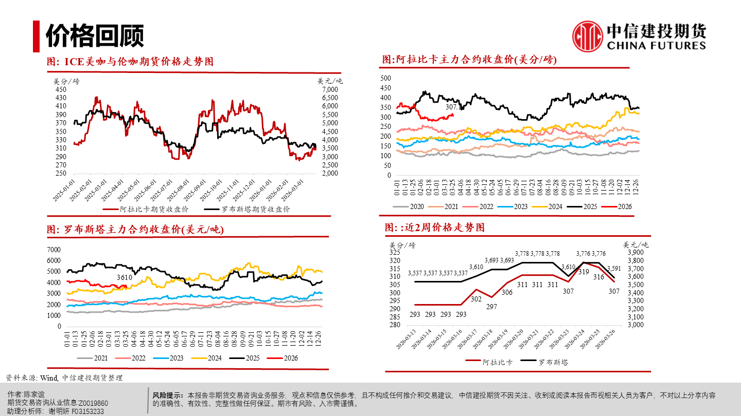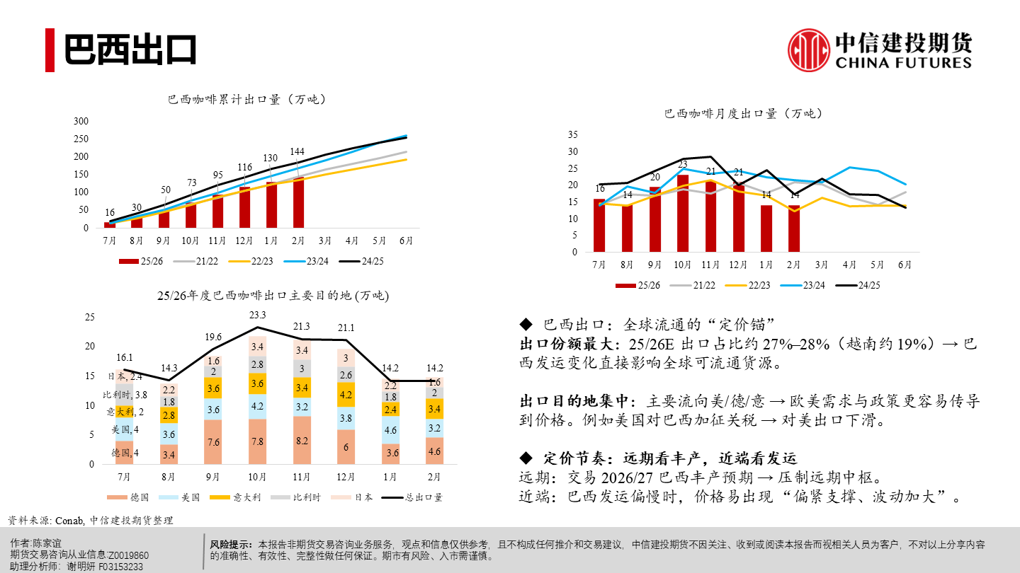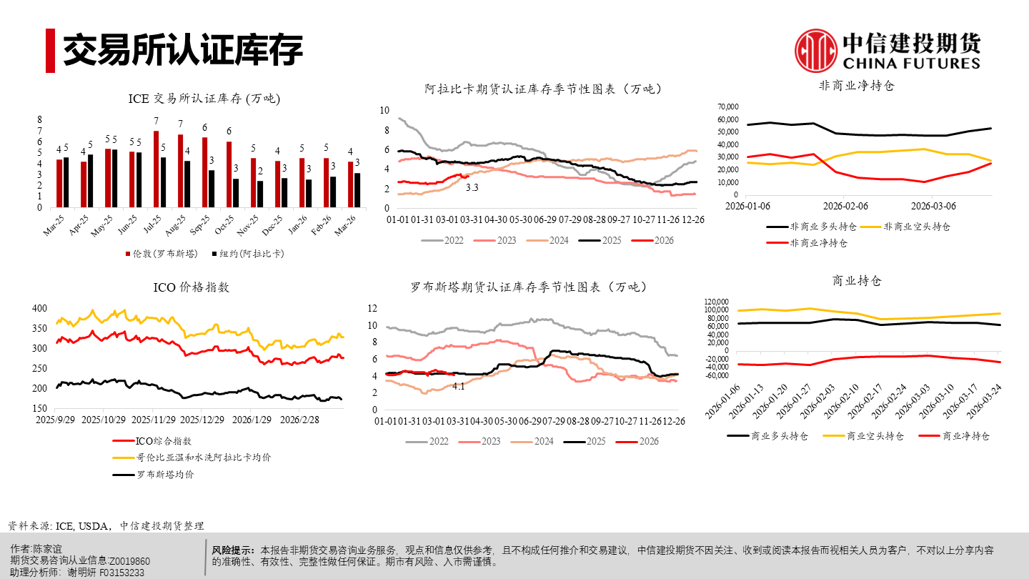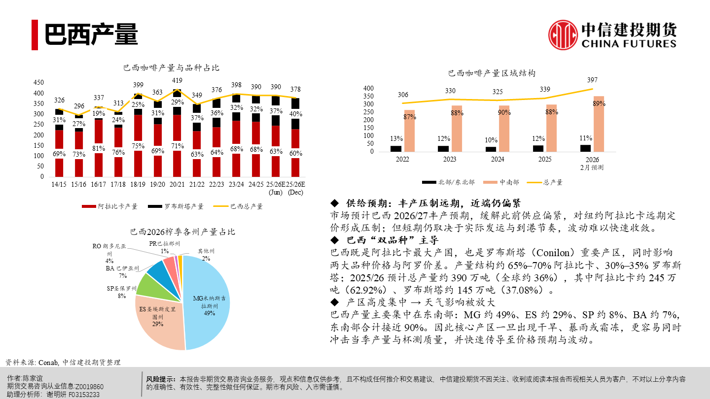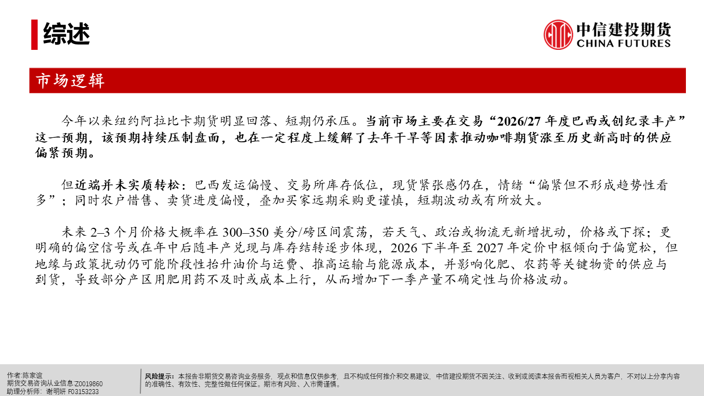 | 今年以来纽约阿拉比卡期货明显回落、短期仍承压。当前市场主要在交易“2026/27年度巴西或创纪录丰产”这一预期,该预期持续压制盘面,也在一定程度上缓解了去年干旱等因素推动咖啡期货涨至历史新高时的供应偏紧预期。 但近端并未实质转松:巴西发运偏慢、交易所库存低位,现货紧张感仍在,情绪“偏紧但不形成趋势性看多”;同时农户惜售、卖货进度偏慢,叠加买家远期采购更谨慎,短期波动或有所放大。 未来 2–3 个月价格大概率在300–350美分/磅区间震荡,若天气、政治或物流无新增扰动,价格或下探;更明确的偏空信号或在年中后随丰产兑现与库存结转逐步体现,2026下半年至 2027年定价中枢倾向于偏宽松,但地缘与政策扰动仍可能阶段性抬升油价与运费、推高运输与能源成本,并影响化肥、农药等关键物资的供应与到货,导致部分产区用肥用药不及时或成本上行,从而增加下一季产量不确定性与价格波动。