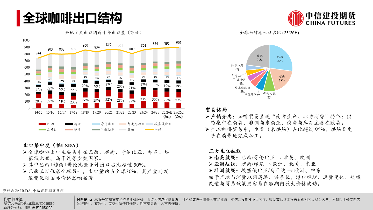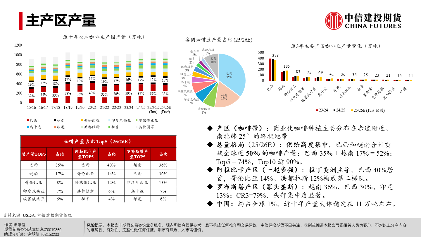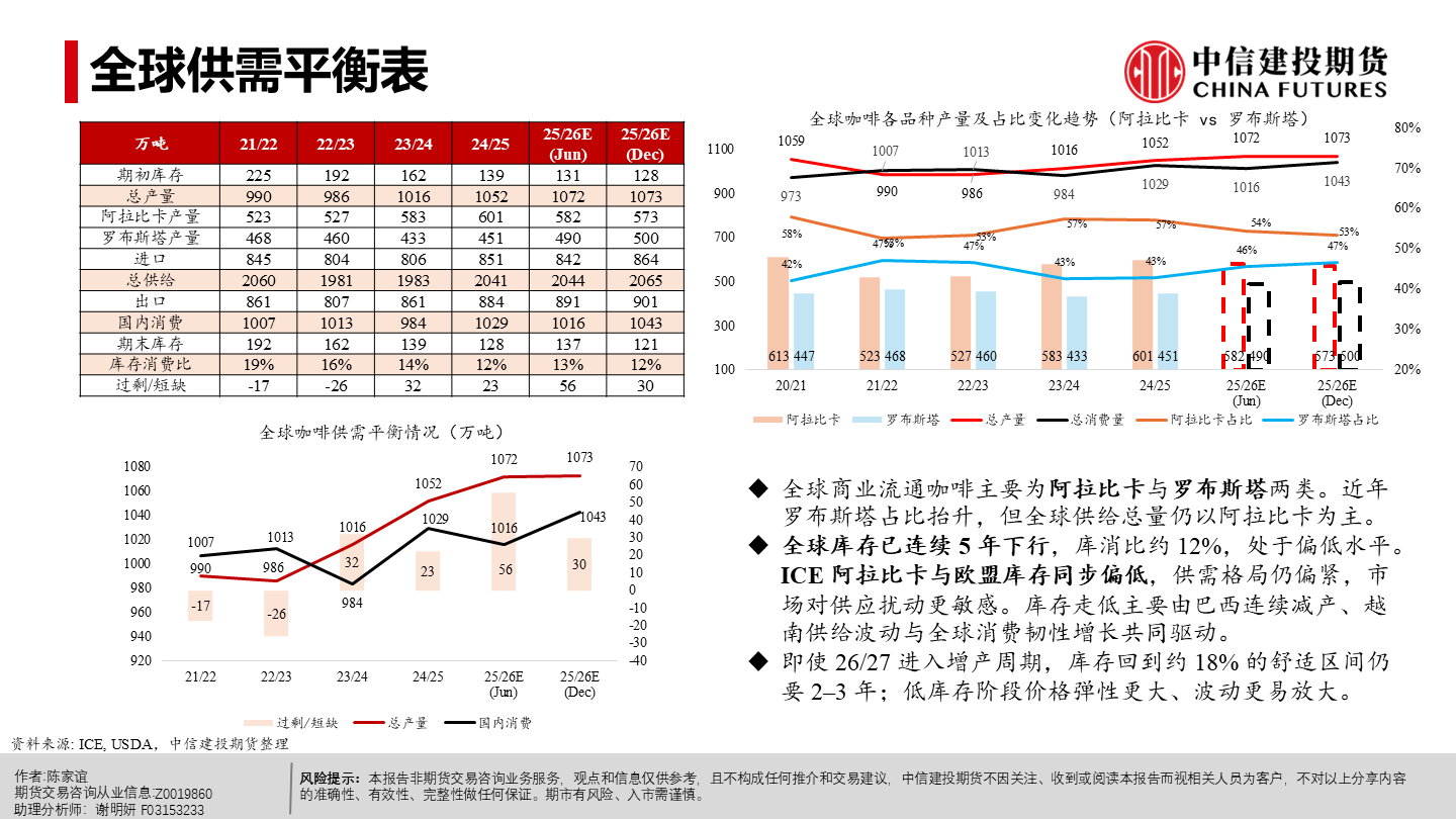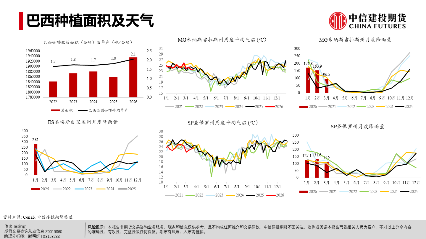 | 今年以来纽约阿拉比卡期货明显回落、短期仍承压。当前市场主要在交易“2026/27年度巴西或创纪录丰产”这一预期,该预期持续压制盘面,也在一定程度上缓解了去年干旱等因素推动咖啡期货涨至历史新高时的供应偏紧预期。 但近端并未实质转松:巴西发运偏慢、交易所库存低位,现货紧张感仍在,情绪“偏紧但不形成趋势性看多”;同时农户惜售、卖货进度偏慢,叠加买家远期采购更谨慎,短期波动或有所放大。 未来 2–3 个月价格大概率在300–350美分/磅区间震荡,若天气、政治或物流无新增扰动,价格或下探;更明确的偏空信号或在年中后随丰产兑现与库存结转逐步体现,2026下半年至 2027年定价中枢倾向于偏宽松,但地缘与政策扰动仍可能阶段性抬升油价与运费、推高运输与能源成本,并影响化肥、农药等关键物资的供应与到货,导致部分产区用肥用药不及时或成本上行,从而增加下一季产量不确定性与价格波动。
