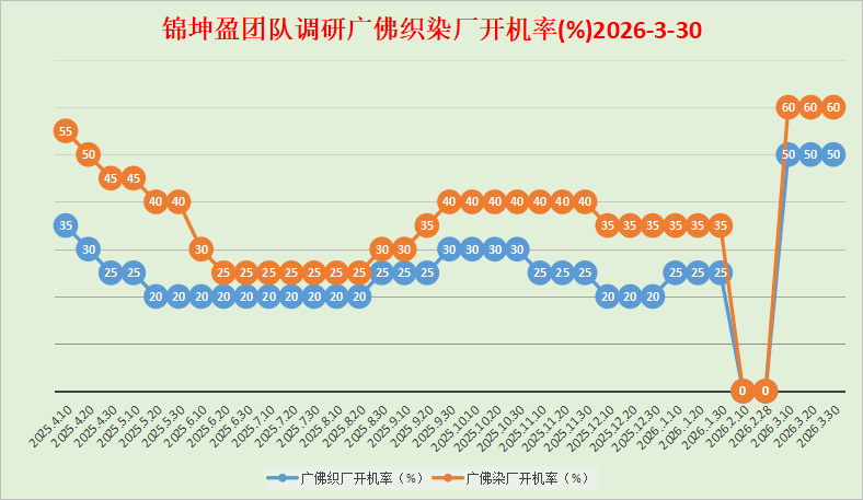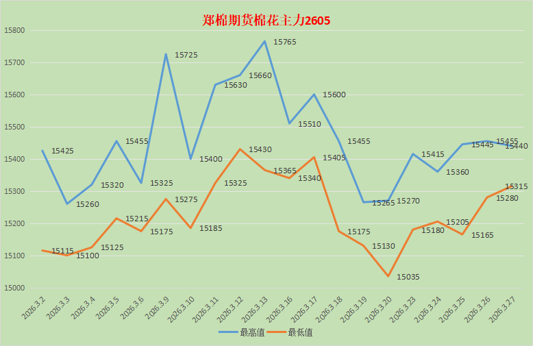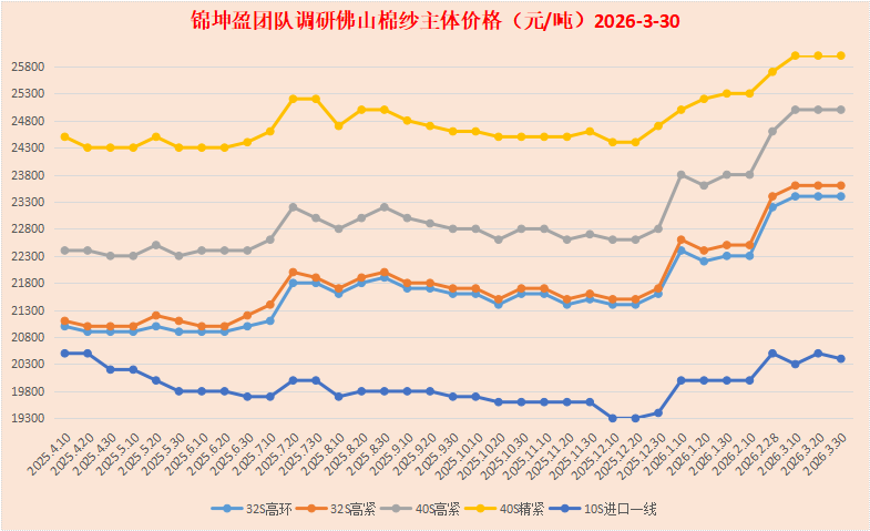 10、纺纱厂:新年原材料棉花疯狂上涨,近一个月化纤类也猛涨价,原材料成本增加,棉纱价格很难同步上调到位。涨价后,纺纱厂实际交售,接订单非常有限。也不敢大量采购棉花,只能等待时机,逢低补库,刚需采购,随用随买。 11、出口:据海关总署统计报告,2026年2月份出口对比去年同期,纺织纱线织物及其制品,服装及衣着附件分别增加78.7%,60.4%;1~2月累计出口对比去年同期,纺织纱线织物及其制品,服装及衣着附件分别增加18%,12.4%。 12、国内需求:3月22日北京中国发展高层论坛2026年会,国家财政部部长明确表示,将加强财政金融政策协同,更加注重扩大内需,进一步激发消费潜能,建设强大国内市场。后续中央多部门密集出台相关金融财政政策,2026年内销市场值得期待。 13、棉纱价格:原材料棉花期现货频繁波动,带动棉纱价格不断调整,经过多轮微调,整体维持前期价格。当前佛山市场现金含税主流报价,国产牌子货纯棉32支高配环纺23200~23400元/吨,纯棉32支高配紧密23400~23600元/吨,纯棉40支高配紧密24700~25000元/吨,纯棉40支精梳紧密25700~26000元/吨,进口一线纯棉10支赛络散货20400元/吨,整柜优惠100元/吨。