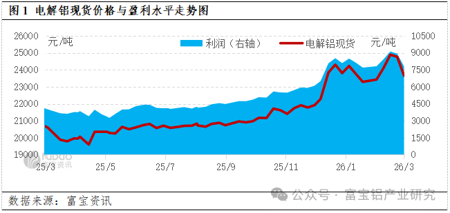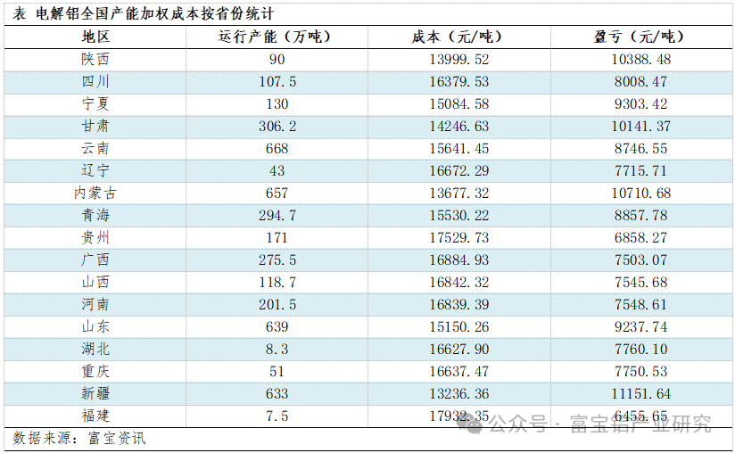 3月电解铝价格上涨,月均价为24388元/吨,较上月涨1003元/吨,涨幅4.29%。一是中上旬月铝价高区间宽幅波动,中东地缘局势突变后,铝价在地缘影响供给的预期下,受产业支撑上行并突破历史新高,但3月19日美联储会议的超预期表态,引发市场交易逻辑转变。地缘局势升级引发通胀风险加剧,美元指数上升,施压市场。二是基本面来看,3月中上旬铝价宽幅波动阶段,需求表现压力攀升,随着铝价回撤至较低区间后,补库行为显著增加,带动累库减缓与基差修复,综合评估需求端仍有一定基本盘,而供给端运行平稳,铝水比继续提升但同比略低与去年,站台库存仍有一定积压。 从富宝资讯跟踪的全国各省份的加权生产成本情况来看,成本最低的企业集中在新疆、内蒙古地区,成本最高的是福建地区。