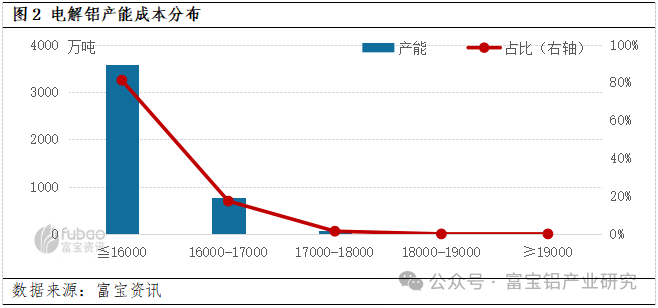 富宝资讯数据监测,本期电解铝产能成本在16000元/吨以下的产能规模为3570.9万吨,占比81.12%;16000-17000元/吨产能规模为662.8万吨,占比15.06%;17000-18000元/吨产能规模为164.5万吨,占比3.74%;18000-19000元/吨产能规模为3.7万吨,占比0.08%;暂无产能成本大于19000元/吨产能规模。