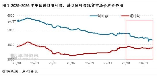 | 【导语】成本推升与需求压制矛盾凸显,一季度进口针叶浆、进口阔叶浆现货市场价格走势分化,市场陷入“高浆价、低纸利”僵局。展望2026年二季度,国内进口纸浆现货市场的核心逻辑将从一季度的“成本对抗需求”,转向“国内供应修复与需求淡季的交锋”,进口浆现货市场价格中枢存在下移风险,其中阔叶浆或较针叶浆展现出更强韧性。 由于中国进口针叶浆、进口阔叶浆量占中国木浆进口量的91.92%,同时由于下游造纸原料结构中针叶浆、阔叶浆用量较大,因此此文价格以针叶浆、阔叶浆价格为代表,描述木浆市场价格变化。 成本推升与需求压制矛盾凸显,一季度进口针叶浆、进口阔叶浆现货市场价格走势分化 2026年一季度,进口木浆市场在成本推升与需求压制之间反复拉锯,演绎出“外盘坚挺、内盘承压、品种分化”的复杂格局,其本质是上下游利润博弈在时间轴上的具象化展开。 一季度,外盘成本端的推力率先发力。阔叶浆外盘连续4个月提涨,逐级抬高后期到货成本,叠加阔叶浆行业较高的集中度,为进口阔叶浆现货市场构筑起坚实底部价格,除2月受春节假期影响短暂环比下滑1.77%外,其余日度价格整体呈现震荡冲高态势。然而,这股上行推力在下游遭遇了强力对冲:造纸企业深陷终端需求疲软与利润微薄的双重困境,降本增效成为刚性约束,导致高价浆接受度极为有限,采购价格始终被压制在逢低补库的4500-4650元/吨区间价位。 受此影响,进口针叶浆现货市场价格因与上海期货交易所纸浆期货主力合约价格高度联动,在纸浆期货价格震荡走低且外盘抬升乏力的拖累下,一季度连续3个月现货市场月均价下滑,月均跌幅均超1.50%,据卓创资讯数据显示,截至3月31日,2026年一季度均价在5313.09元/吨,较2025年四季度下跌3.95%。而进口阔叶浆现货市场价格则凭借外盘的持续抬升与相对稳定的需求支撑,2026年一季度均价在4585.16元/吨,较2025年四季度逆势上涨4.12%,呈现出明显的抗跌韧性。 综合来看,一季度市场的核心矛盾在于:成本端试图向上传导,而需求端构成刚性压制。这一博弈的结果是品种走势显著分化--阔叶浆因集中度高、外盘坚挺而相对强势,针叶浆则因金融属性与需求疲弱共振而持续承压。