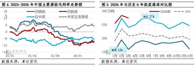 成本推升难掩需求寒意,一季度港存去库速度迟缓 成本端的利好被下游需求的寒意大幅对冲。一季度恰逢春节长假,下游原纸行业经历了相对集中的停机检修,导致木浆采购需求在2月迅速萎缩。更关键的因素在于,尽管纸企在年初尝试发布提价函以传导成本压力,但由于终端消费(如印刷、包装)放量有限,文化纸、白卡纸等主要纸种的价格提涨落地艰难,导致造纸企业利润空间被严重挤压。据卓创资讯监测数据显示,截至3月31日,一季度双铜纸、双胶纸季度毛利率较2025年四季度分别下滑3.17、1.68个百分点;白卡纸、木浆生活用纸毛利率虽较上季度改善0.93、2.11个百分点,但仍处-5.65%、5.12%的低位波动。这种“高浆价、低纸利”的格局,使得纸厂对高价木浆的接受度降至冰点,采购策略仅以刚需、少量补库为主,完全缺乏囤货意愿。港口库存数据从侧面印证了这种供需僵局:截至2月底,中国1地区8港口(保定地区、天津港、日照港、青岛港、常熟港、上海港、宁波港、高栏港及南沙港)纸浆库存连续累库至284.21万吨的高位,而3月去库速度仍显迟缓,3月底库存在274.22万吨,仍高于历史6年同期及历史6年最高点,凸显出下游提货积极性的明显下降。
