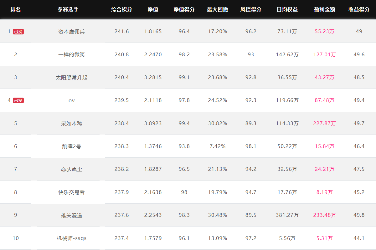 奖金上不封顶 特定期货公司参赛奖金翻倍 优秀选投 每周选优秀选手对接资金 达标必投 单笔最多给1个亿管理型资金 管理型资金盈利分成20%~70% 免费培训/研报/调研/咨询 诚邀您参赛! 为了促进国内期货市场交易人才的发展和成熟,七禾网举办本次“期货CTA英雄联盟”实盘大赛&超级服务,招募优秀的操盘手,为优秀的交易人才搭建桥梁! 第四届大赛圆满结束,第五届荣耀开启,欢迎参赛!第五届大赛已于2025年7月1日开赛,火热报名中,比赛过程中持续接受报名,大赛奖金&管理型资金&超级服务,等你来领! 2023年2月16日后,在主办方指定的几家期货公司中的某一家C公司新开户参赛,享奖金翻倍! 在主办方指定的几家期货公司中的某一家B公司新开户参赛,享奖金翻倍! 大赛中的优秀选手,只要在大赛中有3个月及以上的实盘业绩,主办方将每周发送优秀参赛者的业绩、资料给合作的数十家资方,供其考察是否投管理型资金。至2022年8月12日,资方已选出23名优秀投顾,累计投入超5.5亿元管理型资金。 优秀选投:通过主办方及资方考核后,将获得管理型资金(资金来源:七禾网自有资金(买优秀选手的基金产品)、七禾网股东、数十家合作资方) 在主办方指定的几家期货公司中的某一家B公司新开户参赛,以及2023年2月16日后,在主办方指定的几家期货公司中的某一家C公司新开户参赛,可以按照:“达标必投”进行考核(将给予单笔100万元~1亿元的管理型资金,分红比例20%~70%),详细规则请联系微信:15858201632 大赛综合排名前10名 2026.4.2