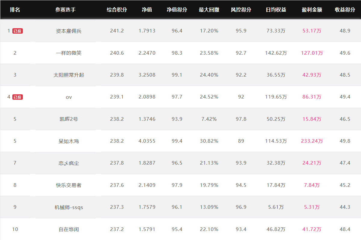 奖金上不封顶 特定期货公司参赛奖金翻倍 优秀选投 每周选优秀选手对接资金 达标必投 单笔最多给1个亿管理型资金 管理型资金盈利分成20%~70% 免费培训/研报/调研/咨询 诚邀您参赛! 为了促进国内期货市场交易人才的发展和成熟,七禾网举办本次“期货CTA英雄联盟”实盘大赛&超级服务,招募优秀的操盘手,为优秀的交易人才搭建桥梁! 第四届大赛圆满结束,第五届荣耀开启,欢迎参赛!第五届大赛已于2025年7月1日开赛,火热报名中,比赛过程中持续接受报名,大赛奖金&管理型资金&超级服务,等你来领! 2023年2月16日后,在主办方指定的几家期货公司中的某一家C公司新开户参赛,享奖金翻倍! 在主办方指定的几家期货公司中的某一家B公司新开户参赛,享奖金翻倍! 大赛中的优秀选手,只要在大赛中有3个月及以上的实盘业绩,主办方将每周发送优秀参赛者的业绩、资料给合作的数十家资方,供其考察是否投管理型资金。至2022年8月12日,资方已选出23名优秀投顾,累计投入超5.5亿元管理型资金。 优秀选投:通过主办方及资方考核后,将获得管理型资金(资金来源:七禾网自有资金(买优秀选手的基金产品)、七禾网股东、数十家合作资方) 在主办方指定的几家期货公司中的某一家B公司新开户参赛,以及2023年2月16日后,在主办方指定的几家期货公司中的某一家C公司新开户参赛,可以按照:“达标必投”进行考核(将给予单笔100万元~1亿元的管理型资金,分红比例20%~70%),详细规则请联系微信:15858201632 大赛综合排名前10名 2026.4.3