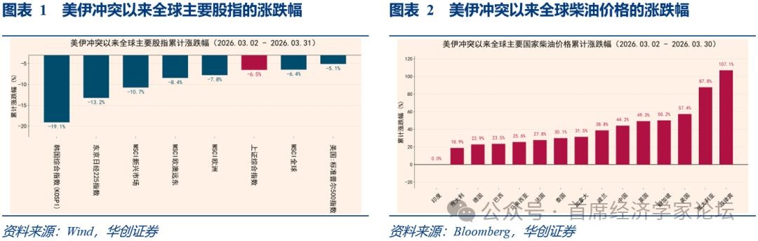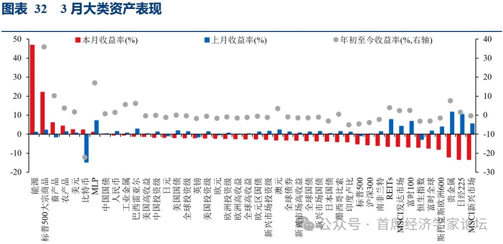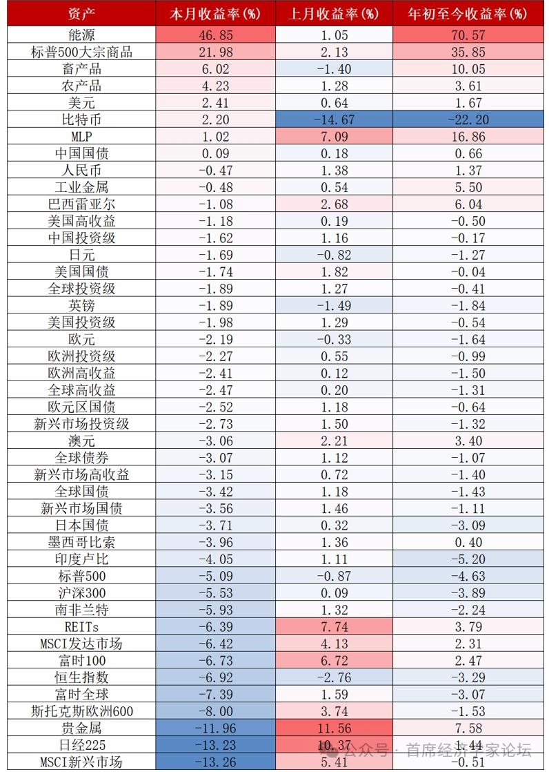 | 一、十张图速览全球资产脉络 (一)美伊冲突下的能源通胀与权益杀跌 2026年2月底至3月底,地缘冲突引发了典型的宏观避险冲击。在商品端,全球柴油价格呈现极端的非对称暴涨。高度依赖海运的亚太节点(菲律宾107%、澳大利亚88%)遭遇断供恐慌;欧美及贸易枢纽涨幅达30%-50%。在权益端,高昂的能源成本直接重创了全球股市。严重依赖能源进口的亚太制造业大国领跌全球(韩国-19.1%,日本-13.2%),欧美核心宽基指数普遍回调约8%。相比之下,中国A股(上证综指-6.5%)跌幅较小,其底层逻辑正是中国较好地平滑了极端能源通胀的冲击,展现出了较强的资产韧性。