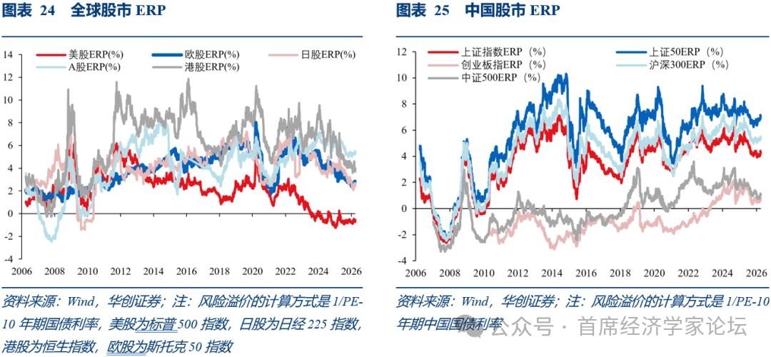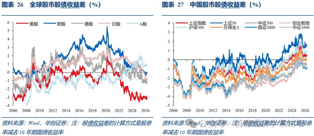 (六)中美股市定价逻辑存在确定性溢价与宏观折价的分化 当前中美核心资产截然不同的“估值-盈利”定价体系:对于标普500,估值与盈利能力呈现健康的“强正相关”。当前其预期净利润率处于13%-14%的历史高位,市场给出了20-26倍的高估值。这表明全球资金高度认可美股头部企业的盈利护城河,愿意为其长期的“增长确定性”支付高昂溢价。反观沪深300,当前A股利润率虽已回升至9%-10%的合理区间,但市盈率却仍处于底部,反映出市场资金对A股盈利修复的可持续性仍在观望。