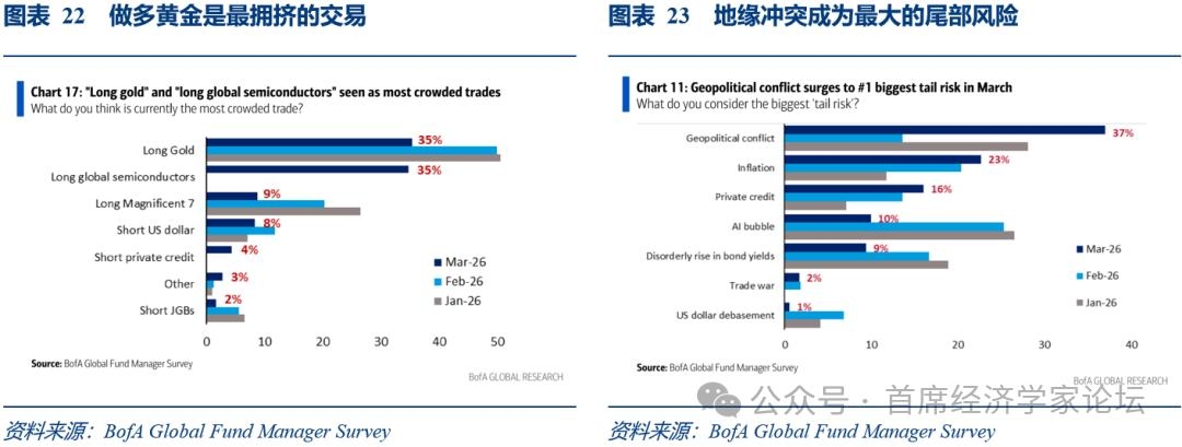 (二)从预期面角度:地缘冲突成为最大的尾部风险 根据美银全球基金经理调查报告,地缘冲突成为最大的尾部风险。2026年2月,25%的基金经理认为AI科技泡沫是最大的尾部风险,其次是通货膨胀(20%),第3位是债券收益率无序上涨(17%)。2026年3月,37%的基金经理认为地缘冲突是最大的尾部风险,其次是通货膨胀(23%),第3位是私募信贷(17%)。