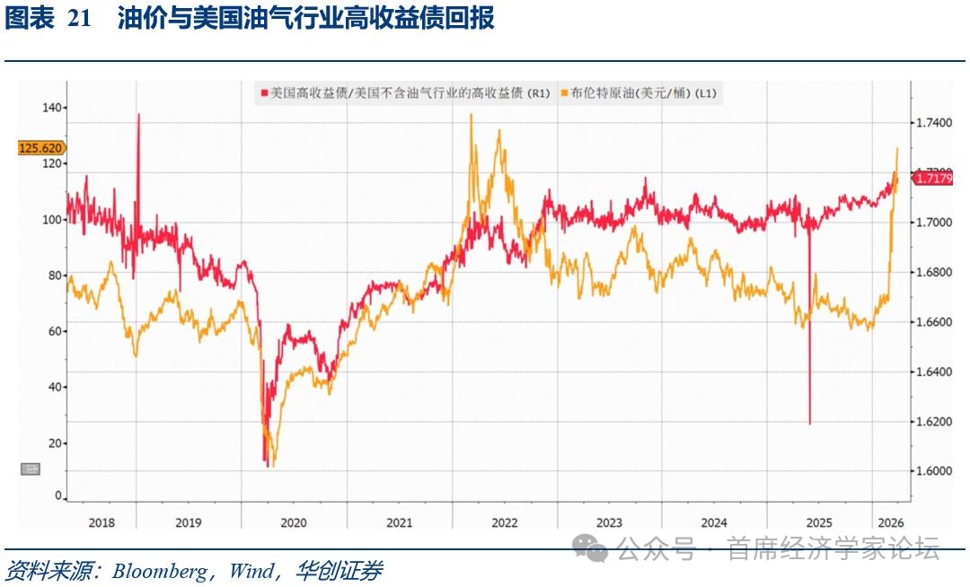 美国油气开发企业的垃圾债相对于垃圾债整体市场的回报表现与油价走势高度一致。油价上涨不利于实体经济中的大多数行业,但有助于改善油气开发企业的财务状况,降低该行业公司债的信用利差水平。