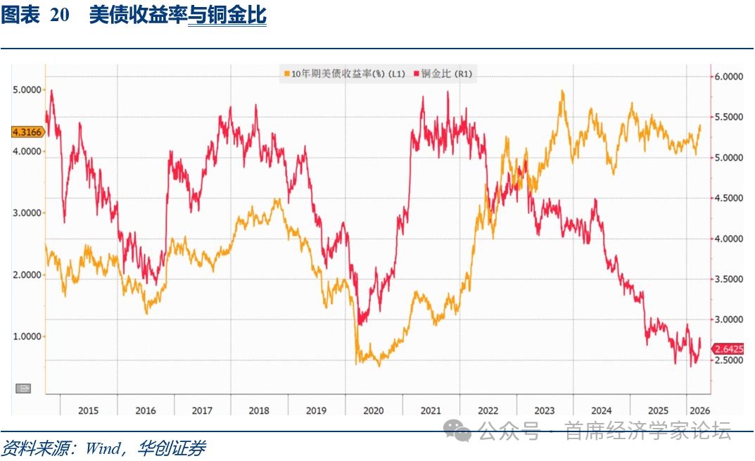 铜金比通常被认为是美债收益率的领先指标,其背后的原理是:铜具有工业属性,被广泛应用于电子电气、家电、机械、建筑等领域,铜的需求通常反映了实体经济的活跃程度;而黄金具有价值储藏功能和避险价值。铜金比可以作为市场对风险资产的偏好和对美国国债安全的感知程度的指标。