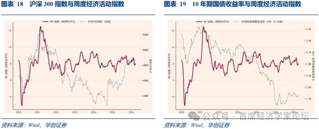 二、四个角度看资产 (一)从基本面角度:周度经济活动指数回升 华创宏观周度经济活动指数是衡量经济基本面状况的高频指数,可以通过资产价格与周度经济活动指数的走势观察股债资产价格与经济基本面的背离状况。我们对华创宏观中国周度经济活动指数的4周移动平均与10年期国债收益率以及沪深300指数做相关分析,发现2020年以来两者的相关系数分别为0.33和0.11。