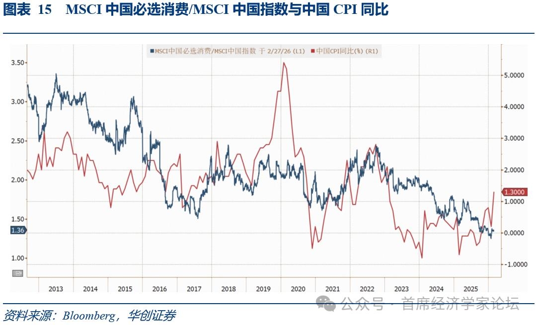 (九)中国消费板块或将伴随通胀中枢回升迎来估值修复 回顾历史,中国消费板块相较于MSCI中国指数的PE估值溢价,始终与中国CPI同比的走势保持着高度的正相关性。近年来,受CPI增速持续低位运行的压制,市场对消费端的盈利预期走弱,导致该溢价被大幅压缩。随着宏观政策发力及内需逐步企稳,CPI中枢或将迎来温和的触底回升。这一核心宏观价格信号的企稳,将成为驱动消费板块“均值回归”的核心催化剂,预计将带动消费股的估值溢价空间打开,并迎来实质性的修复。