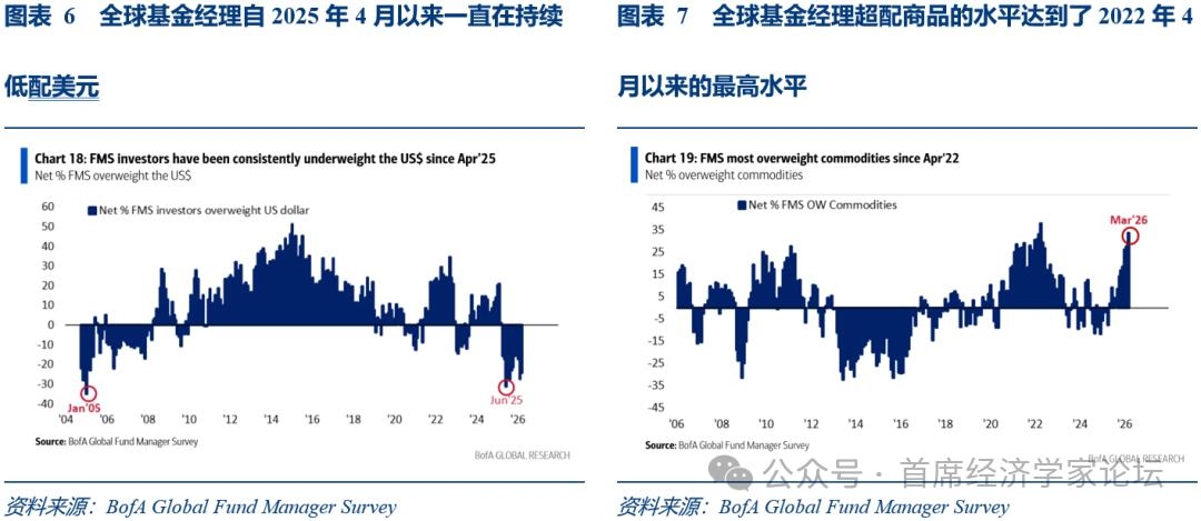 (四)“弃美元,买商品”成为全球基金经理共识 根据2026年3月的美国银行全球基金经理调查,有24%的基金经理持看空美元的态度,对美元的看空情绪相比上个月有所缓和;自2025年4月开始,全球基金经理一直在持续低配美元;而在2025年6月,全球基金经理的美元持仓比例跌至历史最低水平,净减持比例达到了31%。此外,3月份,全球基金经理持有大宗商品的净持仓比例达到了34%,这一比例是自2022年4月以来最高的。