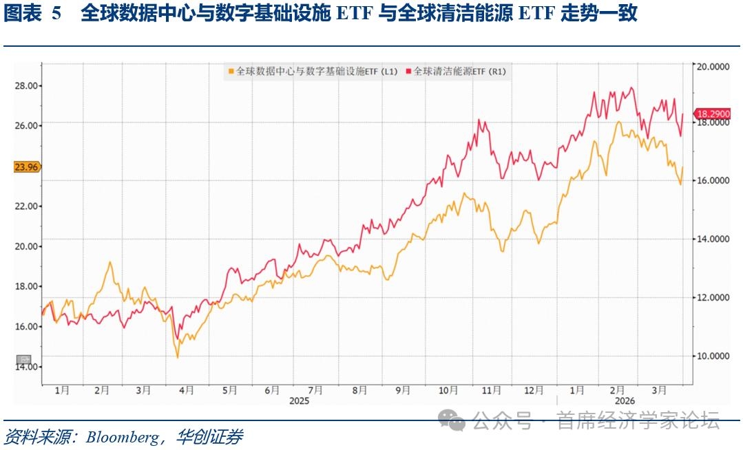 (三)AI时代数字基建ETF与清洁能源ETF出现共振 自2025年初以来,全球清洁能源ETF与数据中心及数字基建ETF的走势呈现出高度的同频共振。这一紧密联动的底层定价逻辑在于,AI算力催生了极其庞大的电力需求,倒逼能源交易打破环保意识形态的限制。面对美国当前日益严峻的电力负荷瓶颈,科技巨头与资本在能源供给端彻底转向了实用主义。为了填补数字基础设施急剧扩张带来的庞大能源缺口,市场直接推动了包括清洁能源在内的所有发电资产进入扩容周期。