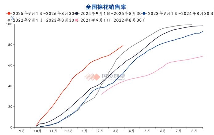 所有数据来源:USDA,国投期货 美棉25/26年度签约,也渐近末期。截至3月19日当周,25/26年度美棉陆地棉和皮马棉总签售量224.49万吨,占年度预测总出口量(261万吨)的86%,同比减少6%;累计出口装运量134.65万吨,占年度总签约量的60%。中国对于美棉签约比较克制,越南签约大幅增加,随着国内换准税发放,中国对于下年度的预签约有所增加。目前美棉签约也已经处于末期,可供签约量也相对有限。 未来美棉种植和天气表现,将逐渐成为市场关注的焦点,市场博弈的重心向新年度转移;虽然美棉已经经过一轮上涨,但从长期角度来看,价格仍不算高,如果新年度全球供给收缩的预期能够逐步落实,长期美棉价格重心有望逐步抬升,长期价格弹性较好。 2.国内旺季消费表现尚可,关注政策扰动和后续消费表现 国内2026年进口配额发放较早,发放时间为3月16号,2026年棉花进口滑准税加工贸易配额总量为30万吨,实行凭合同申领的方式发放。今年配额数量相对过去两年增加10万吨,发放事件较过去两年大幅提前,过去两年发放事件为7、8月份。由于进口配额主要针对出口订单,且发数量整体偏低,对于国内影响相对有限,但由于发放事件较早,短期给市场还是带来小幅的冲击。另外市场也在忌惮,后续调控政策是否跟进。 截至3月15日,全国棉花商业库存523.02万吨,较2月底减少24.68万吨,高于去年同期5.31万吨;其中新疆疆内棉花库存为388.5万吨,较2月底减少18.7万吨,低于去年同期12.91万吨。相较于2月底,全国商业库存由同比偏低转为偏多,但新疆商业库存同比仍然偏低,近几年新疆纺织产能增量较大,疆内的棉花消费量一再抬升。 截至目前,金三银四的旺季需求表现尚可,尤其是棉纱和坯布库存消化较快,已经来到偏低的位置,国内纺企开机同比偏高,但纺企的棉花原料库存偏高,节前备货相对充足,纺企对于棉花采购以逢低买入为主,短期现货成交一般。 春节之后旺季消费表现尚可,但市场也明显感觉到节后棉花现货需求弱于春节之前;国内棉花累计销量也是大幅偏多,截至3月19日,累计加工皮棉737.2万吨,同比增加73.2万吨,较过去四年均值增加115.7万吨;全国销售率为76.8%,同比提高18.1个百分点,较过去四年均值提高21.6个百分点;累计销售皮棉568.3万吨,同比增加176.7万吨,较过去四年均值增加216.0万吨。市场也有一些担忧,尤其是最近国内滑准税配额发放,而且关于供给调控政策传闻较多;虽然销量同比大幅偏多,棉花消费表现也是偏强,但市场仍然警惕消费是否被透支或前置。但是如果后续商业库存消化延续良好表现,供给偏紧预期或将延续。 近期内外价差连续缩窄,内外棉花基本面有点转向的趋势,国内节后金三银四的旺季需求表现尚可,但棉花需求相对一般;且市场对于未来供给端调整政策有担忧,对于棉花需求,市场担心需求或被提前透支,后续情况都需要持续跟踪验证。美棉种植面积在多年低位,25/26年度签约数据尚可,下年度全球供给存在收缩的预期,再加上美棉持续在低位震荡,估值相对便宜。中长期美棉仍存在上行的驱动。图2:全国棉花销售率 单位:% 所有数据来源:ifind,国投期货