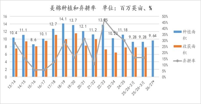 | 近期美棉从底部连续上涨,主要受到能源价格上涨、中国发放进口配额,以及此前种植面积减少预期的推动;美国农业部公布的美棉种植面积意向报告超出市场预期,此前预期减少变成了增加,但从长期来看,美棉的种植面积仍在低位,关注后续的种植和天气情况。从长期来看,26/27年度,全球供给存在收缩的预期,中国种植面积减少,巴西2026年产量环比下降,以及美棉种植面积在低位等,长期美棉价格重心或缓慢抬升。 1.美棉中期空间受限,长期弹性或较大 全球25/26年度供给呈现过剩的状态,美棉签约数据表现一般,这或是种植限制美棉高度重要因素,但随着北半球进入种植季,市场关注的焦点向新年度转移。美棉种植面积意向报告,数据高于市场预期,美国2026年棉花种植面积预估为964.0万英亩,市场预期为922.9万英亩,2025年实际种植面积为928.3万英亩;2026年种植意向报告,其中陆地棉种植面积预期为951万英亩,环比增加4%;其中匹马棉种植面积预期为13万英亩,环比减少8.1%;全美棉花种植面积预期为964万英亩,环比增加3.9%。 虽然报告数据高于市场预期,但从长期来看,美棉种植面积仍在多年低位,种植面积处于13/14年度以来倒数第三位;目前公布仅仅是种植意向,种植面积确认要关注6月份的种植面积报告;最终产量仍要跟踪天气和价格等,最终种植面积、弃耕率和单产,综合起来决定最终的产量。而且美棉弃耕率波动较为剧烈,往往对于产量起到关键性的作用。 图表1:美棉种植和弃耕率 单位:百万英亩、%