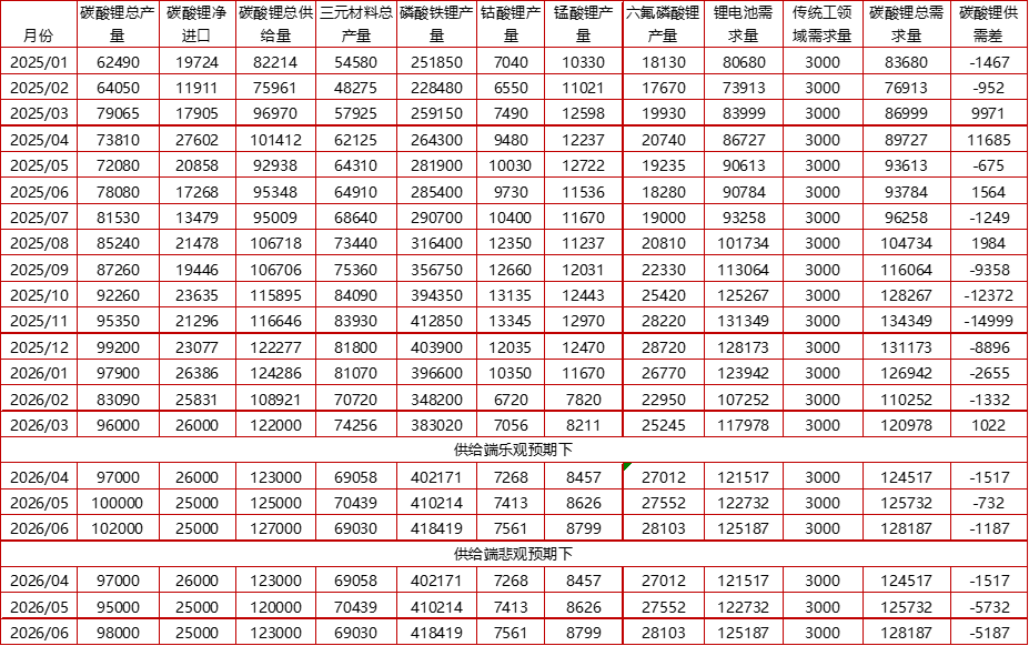 资料来源:SMM,公开资料整理,一德有色 05 总结与展望 从供应端看,澳矿Mt Marion矿山以及Wodgina矿山产量指引进行上修;非洲津巴布韦暂停锂精矿出口,对此市场虽然相对乐观,但停止出口已经过去一个月,新配额申请尚不明确,对供给实实在在构成了影响,我们对非洲供给量进行了下调;国内江西云母矿复产延后,对影响量进行了上调,所以调整后总供应量下降。 从需求端看,今年前两个月新能源汽车产量同比下降8.8%,但由于近期出口表现超预期,叠加汽车带电量提升以及重卡渗透率在提高,所以我们维持动力耗锂量20%的增速预期;储能方面,1月全球储能电芯市场延续高景气态势,头部储能电芯厂产能利用率维持高位,地缘政治导致市场能源转型需求愈加迫切,但短期地缘政治延缓甚至终止了部分中东地区部分储能项目的投放,暂维持年初对于储能出货量增速 利润角度看,一季度,澳矿价格在1500-2300美元/吨区间内运行,根据矿企财报数据,2025年四季度澳矿运营成本在600美元/吨之下,所以一体化矿山利润非常可观,所以澳矿前期停产项目多有复产准备;国内云母一体化成本多在6.5万元/吨之下,所以云母利润极好;对于外采而言,1月份外采锂辉石以及锂云母冶炼一度出现了较好的利润,但随着锂盐价格回落,海外辉石价格坚挺,外采锂辉石冶炼再次出现亏损。 总体看,由于资源端扰动不断,碳酸锂过剩格局有望发生转变,估值因此抬升。二季度,由于津巴布韦锂矿出口政策以及国内枧下窝矿的复产存在不确定性,所以对二季度的供应量给出了两种不同的数据预估。根据上方对二季度月度供需平衡表的预估,我们对二季度碳酸锂盘面运行区间做出预估: 供给乐观预期下,价格密集运行区间预计在【138000,168000】; 供给悲观预期下,价格密集运行区间或在【140000,190000】。 责任编辑:七禾编辑 |