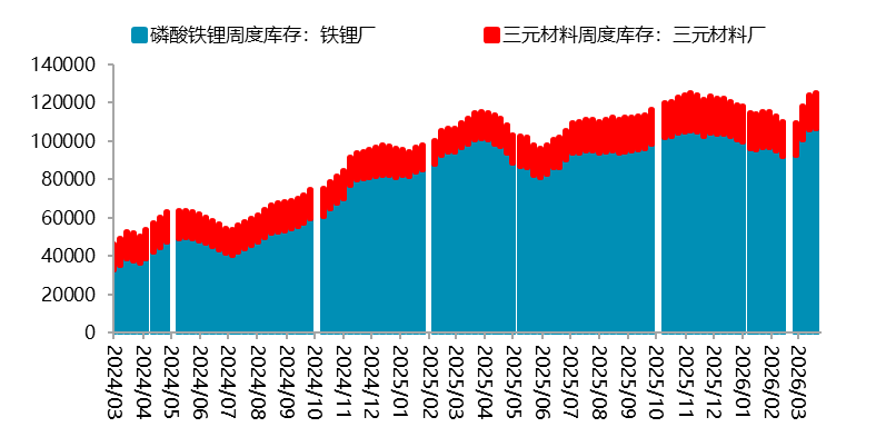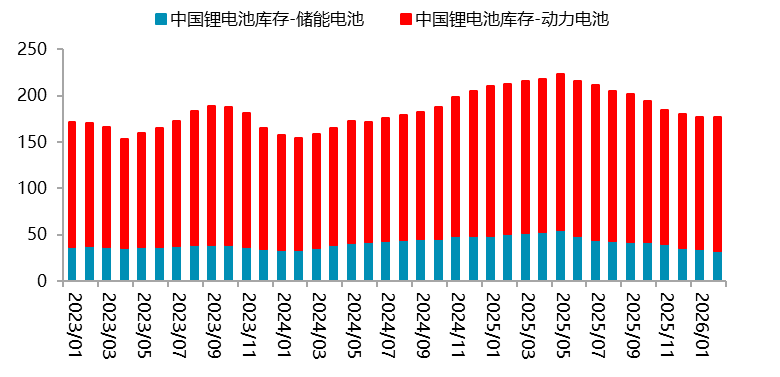 资料来源:SMM,一德有色 04 库存与供需平衡 4.1 库存分析:产业链库存变动存在差异化表现 一季度,产业链从终端汽车到电池,再到碳酸锂库存变化呈现差异化。其中,终端新能源汽车库存在经历了去年4-8月份的去库之后再度累库至前高水平;电池方面,库存维持去化,但一季度库存去化速度放缓,截至2月底,国内锂电池库存合计177.3GWh,相较去年12月底去化3.4GWh。其中动力电池145.1GWh,相较去年12月底去化0.3GWh;储能电池32.2GWh,相比去年12月底去化3.1GWh;上游正极材料产成品库存持续增加,其中磷酸铁锂厂增加较为明显;原料端碳酸锂库存维持去化,从周度数据看,当前库存已经降至9.95万吨,相较去年12月底去化10116吨,其中锂盐厂1.73万吨,下游4.66万吨,其他贸易商以及期现商库存3.55万吨。 图 4.1:新能源汽车累计库存(单位:万辆)
