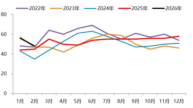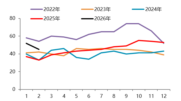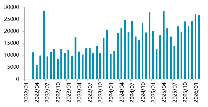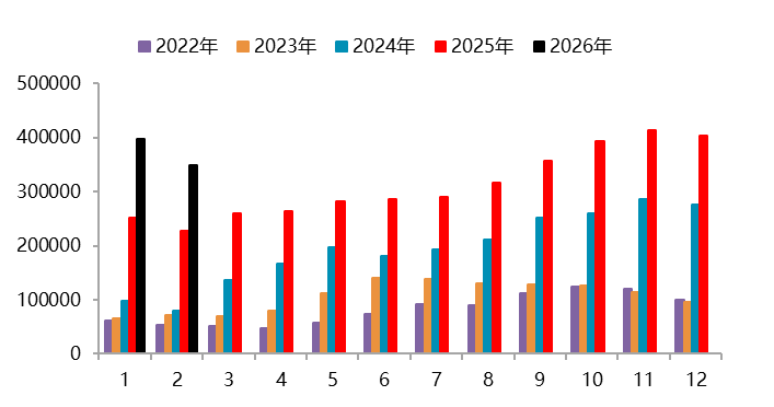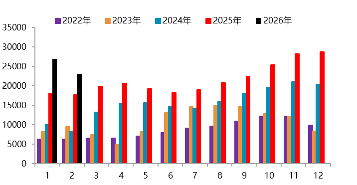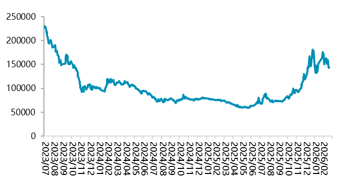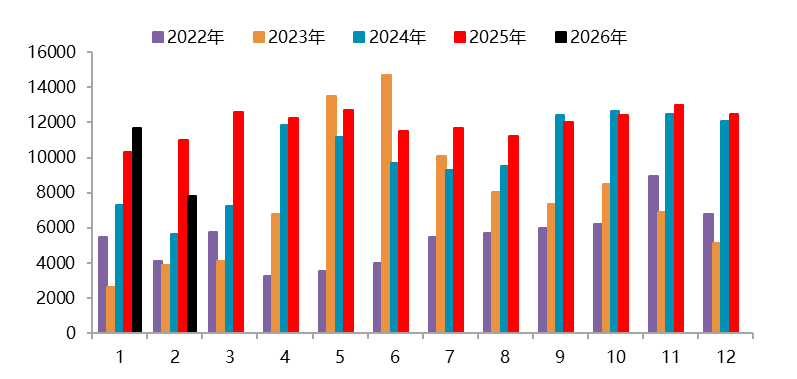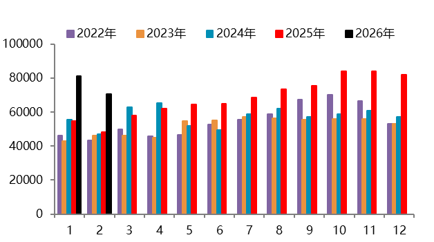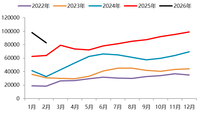 资料来源:Wind,一德有色 2026年2月,国内新能源汽车产销分别完成69.4万辆和76.5万辆,同比分别下降21.8%和14.2%,新能源汽车销量达到汽车新车总销量的42.4%。1-2月,新能源汽车产销分别完成173.5万辆和171万辆,同比分别下降8.8%和6.9%,新能源汽车新车销量达到汽车新车总销量的41.2%。其中,国内销量112.6万辆,同比下降27.5%;出口58.3万辆,同比增长1.1倍。 图 2.4:中国新能源汽车销量(万辆)